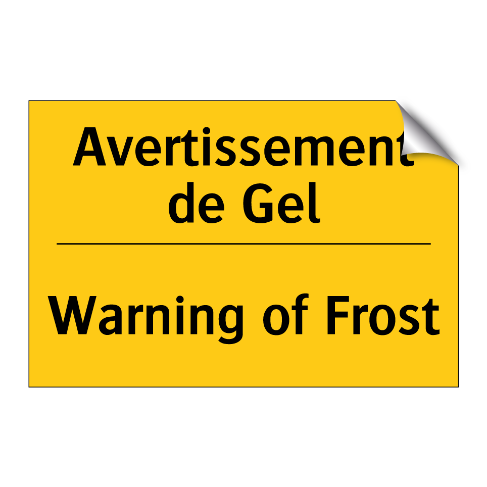 Panneau d'avertissement bilingue avec texte en français : "Avertissement de Gel", et en anglais : "Warning of Frost"