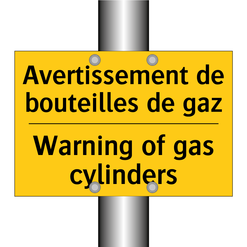 Panneau d'avertissement bilingue avec texte en français : "Avertissement de bouteilles de gaz", et en anglais : "Warning of gas cylinders"