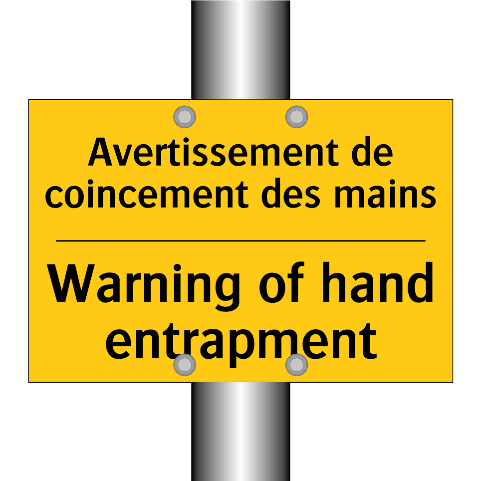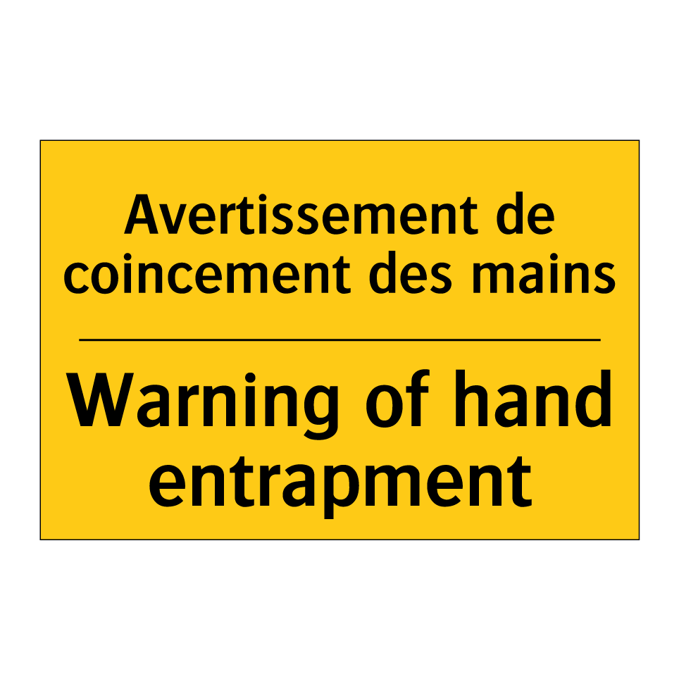 Panneau d'avertissement bilingue avec texte en français : "Avertissement de coincement des mains", et en anglais : "Warning of hand entrapment"