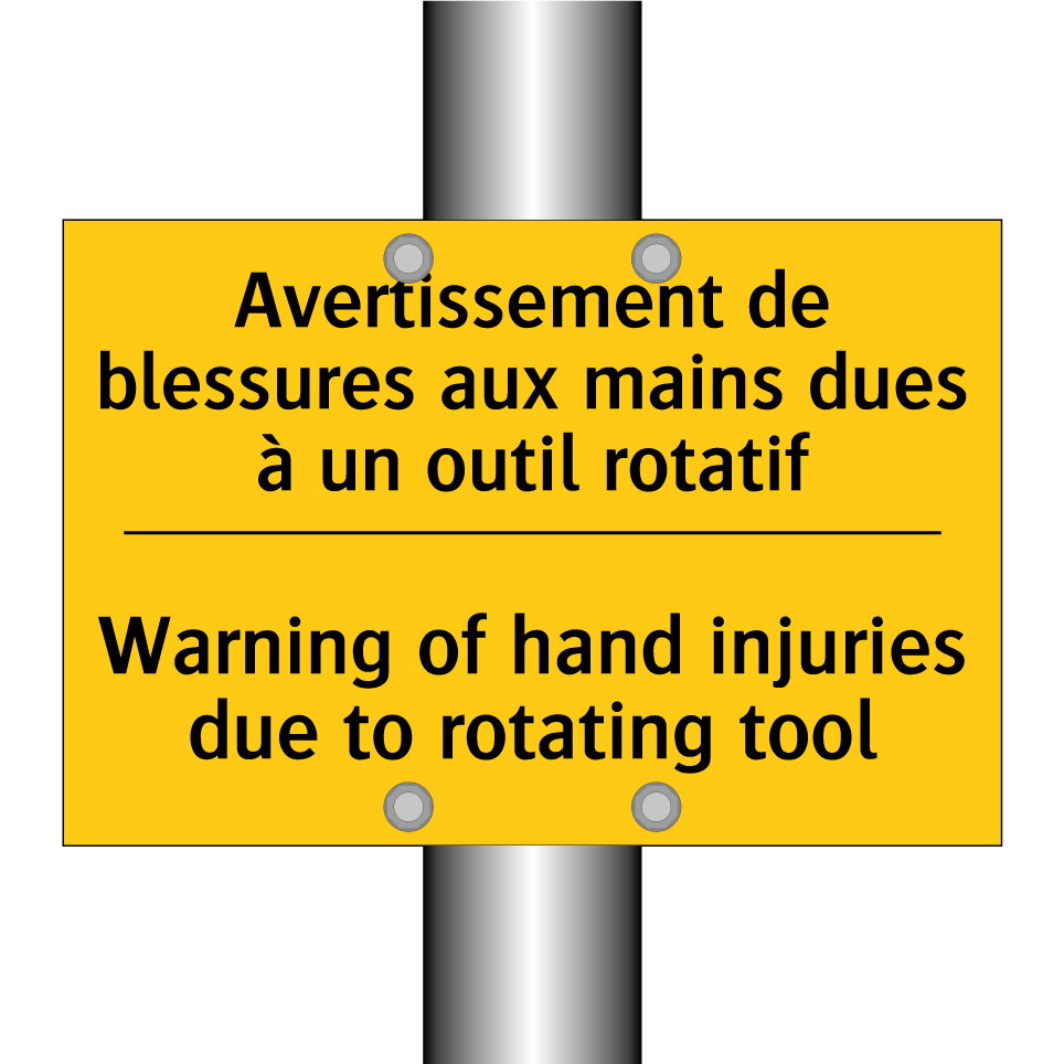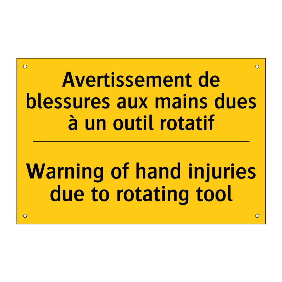 Panneau d'avertissement bilingue avec texte en français : "Avertissement de blessures aux mains dues à un outil rotatif", et en anglais : "Warning of hand injuries due to rotating tool"