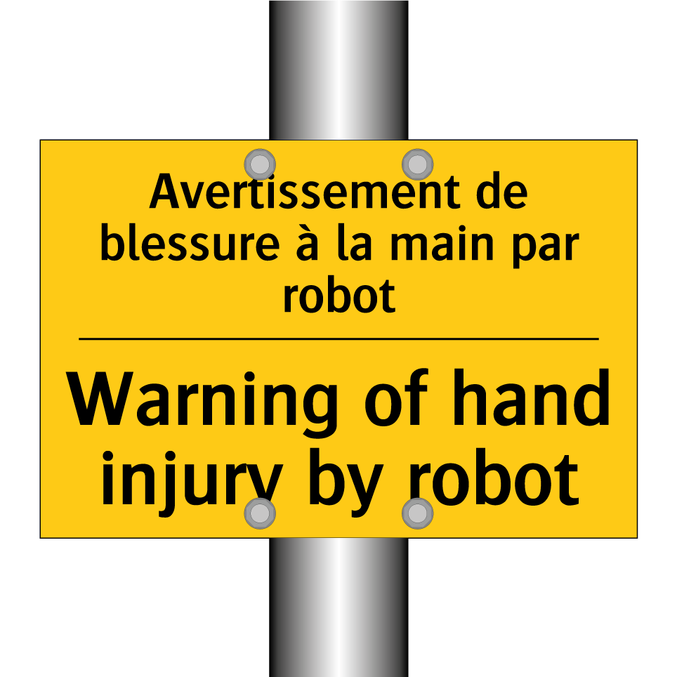 Panneau d'avertissement bilingue avec texte en français : "Avertissement de blessure à la main par robot", et en anglais : "Warning of hand injury by robot"