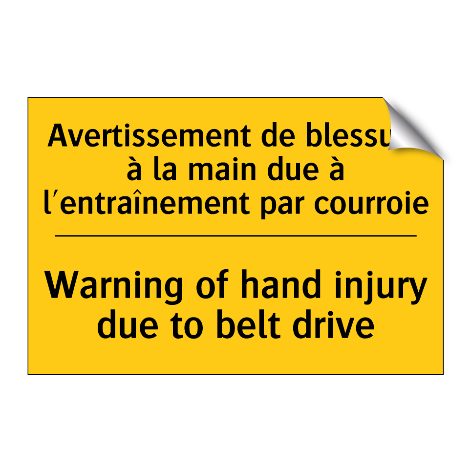 Panneau d'avertissement bilingue avec texte en français : "Avertissement de blessure à la main due à l'entraînement par courroie", et en anglais : "Warning of hand injury due to belt drive"