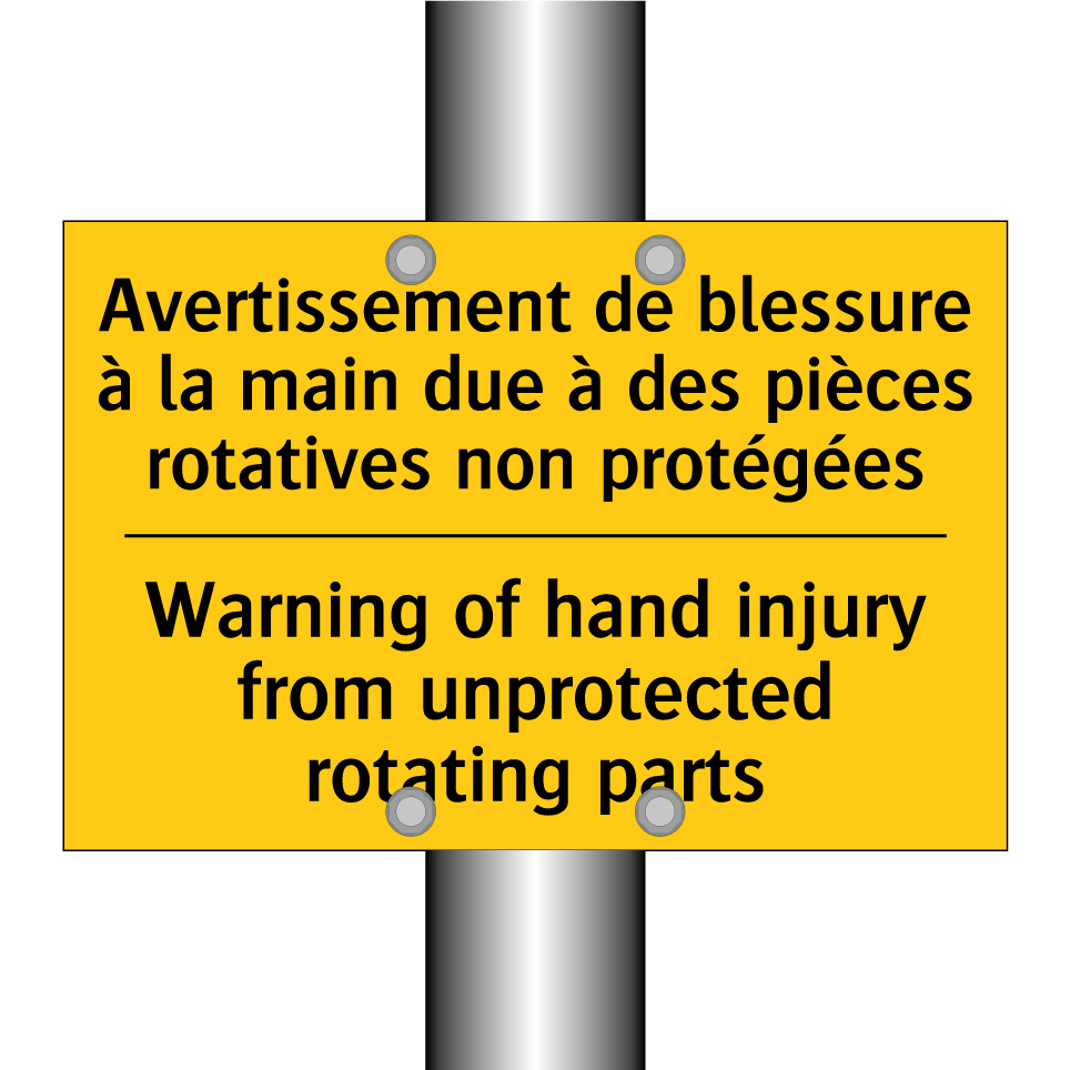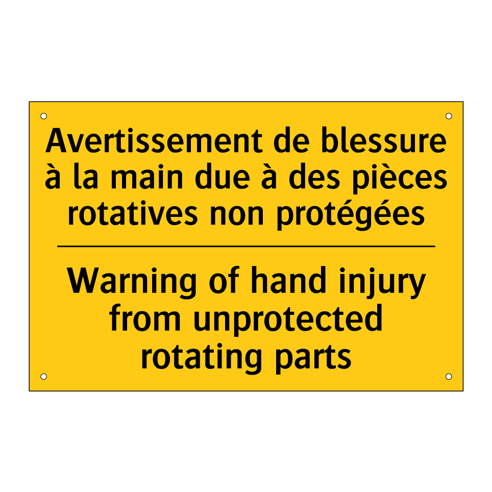 Panneau d'avertissement bilingue avec texte en français : "Avertissement de blessure à la main due à des pièces rotatives non protégées", et en anglais : "Warning of hand injury from unprotected rotating parts"