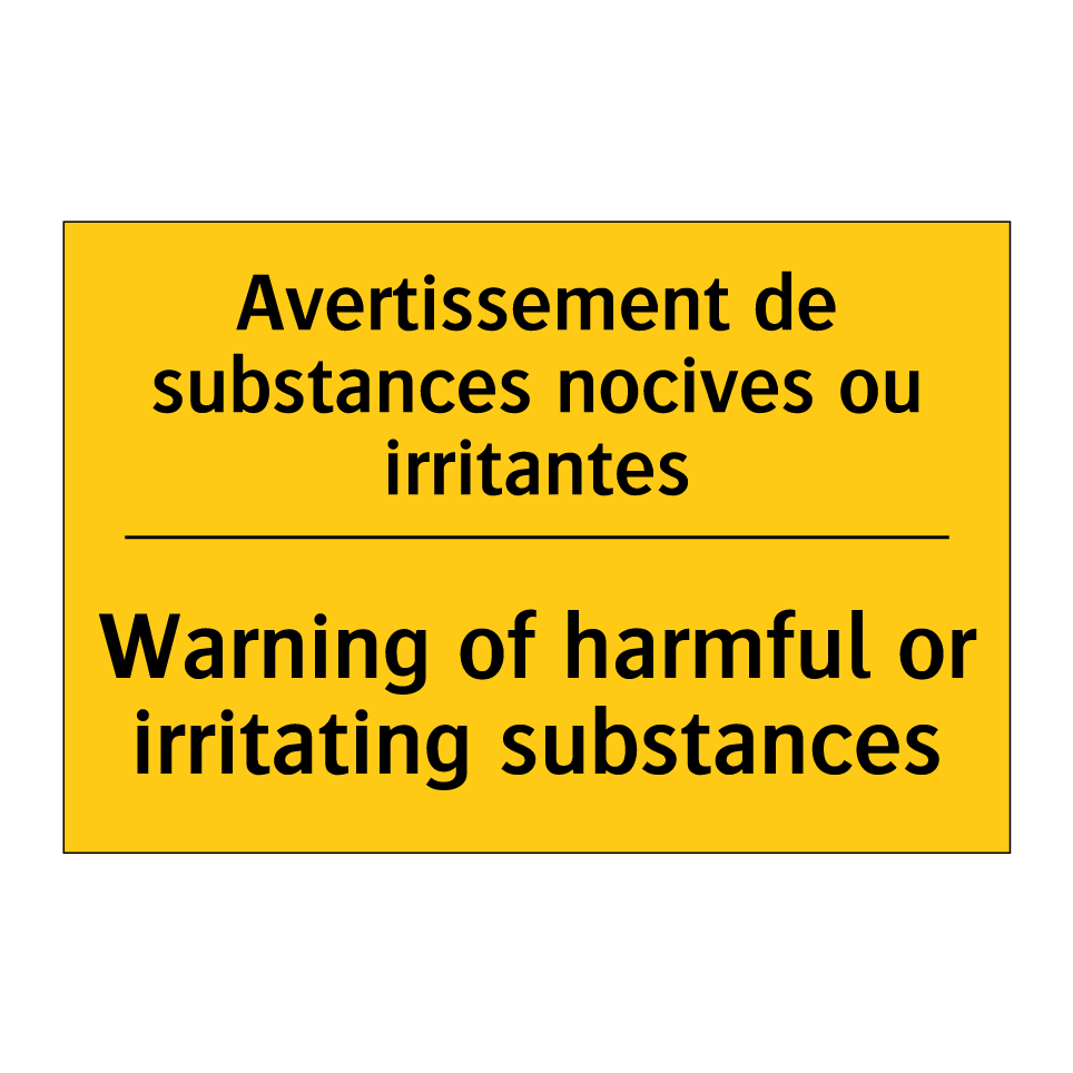 Panneau d'avertissement bilingue avec texte en français : "Avertissement de substances nocives ou irritantes", et en anglais : "Warning of harmful or irritating substances"