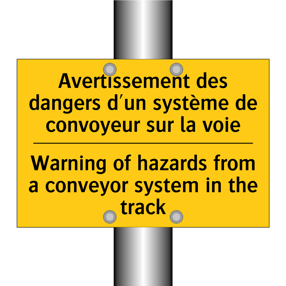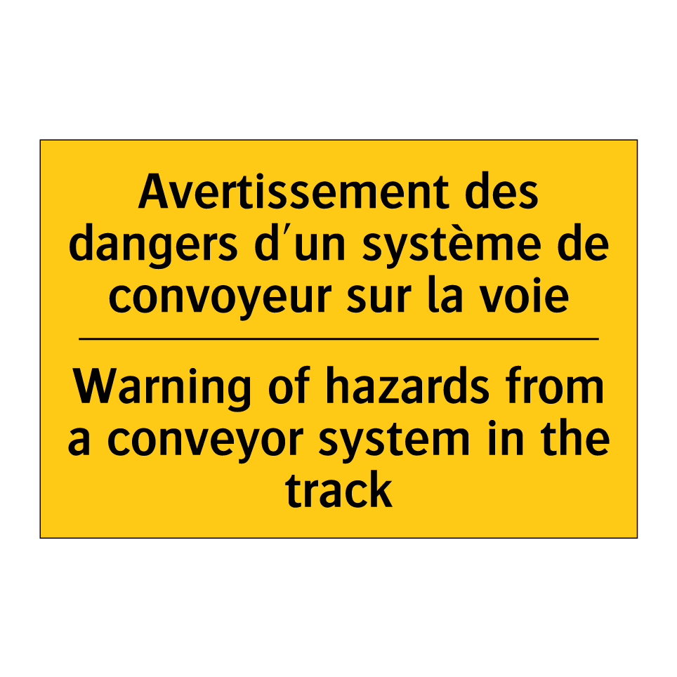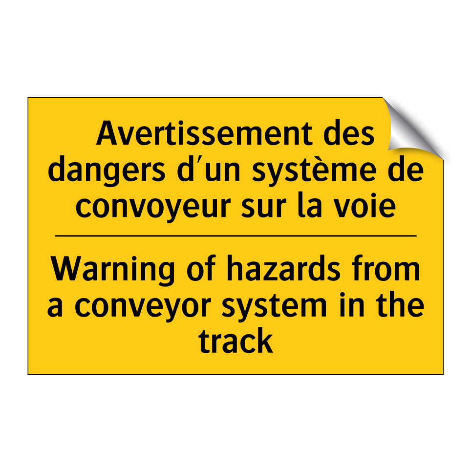 Panneau d'avertissement bilingue avec texte en français : "Avertissement des dangers d'un système de convoyeur sur la voie", et en anglais : "Warning of hazards from a conveyor system in the track"