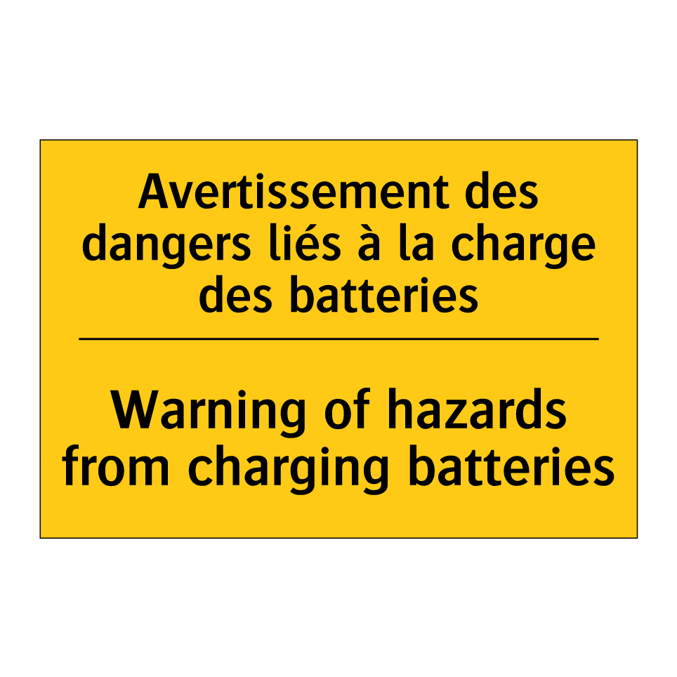 Panneau d'avertissement bilingue avec texte en français : "Avertissement des dangers liés à la charge des batteries", et en anglais : "Warning of hazards from charging batteries"