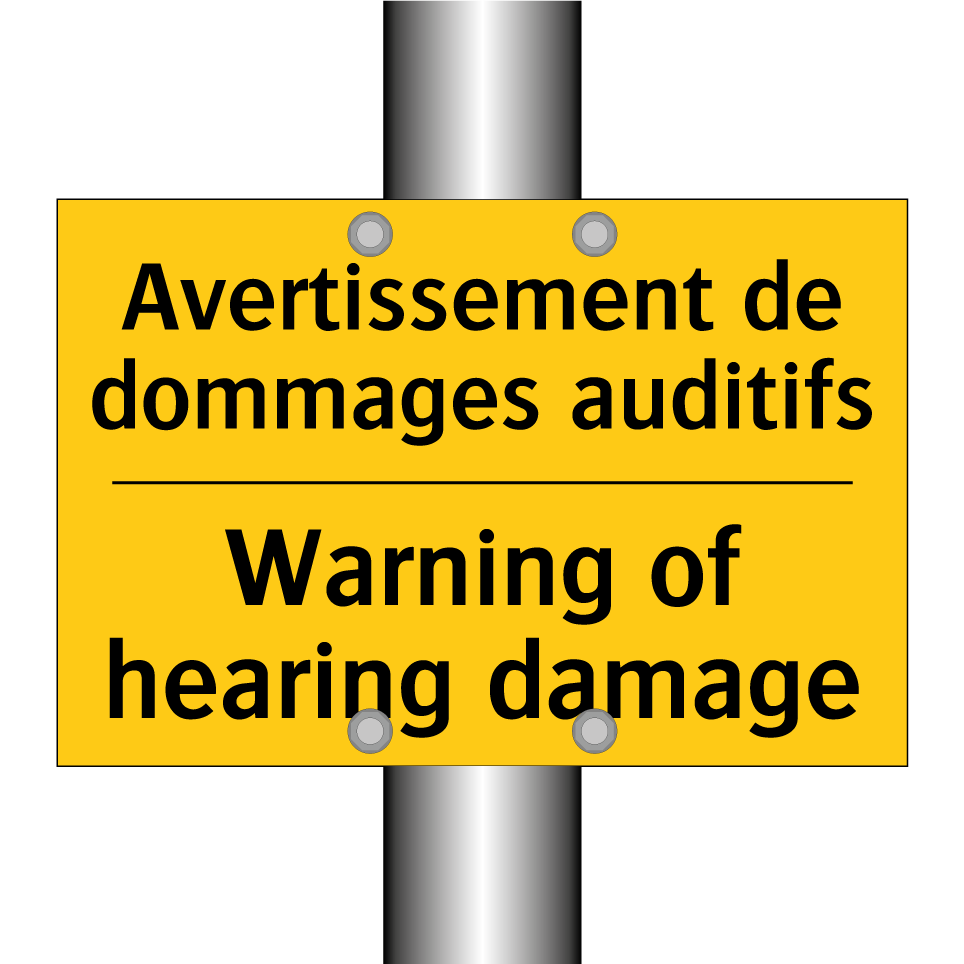Panneau d'avertissement bilingue avec texte en français : "Avertissement de dommages auditifs", et en anglais : "Warning of hearing damage"
