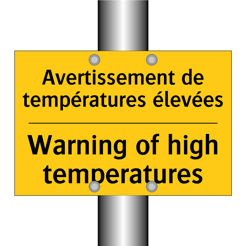 Panneau d'avertissement bilingue avec texte en français : "Avertissement de températures élevées", et en anglais : "Warning of high temperatures"