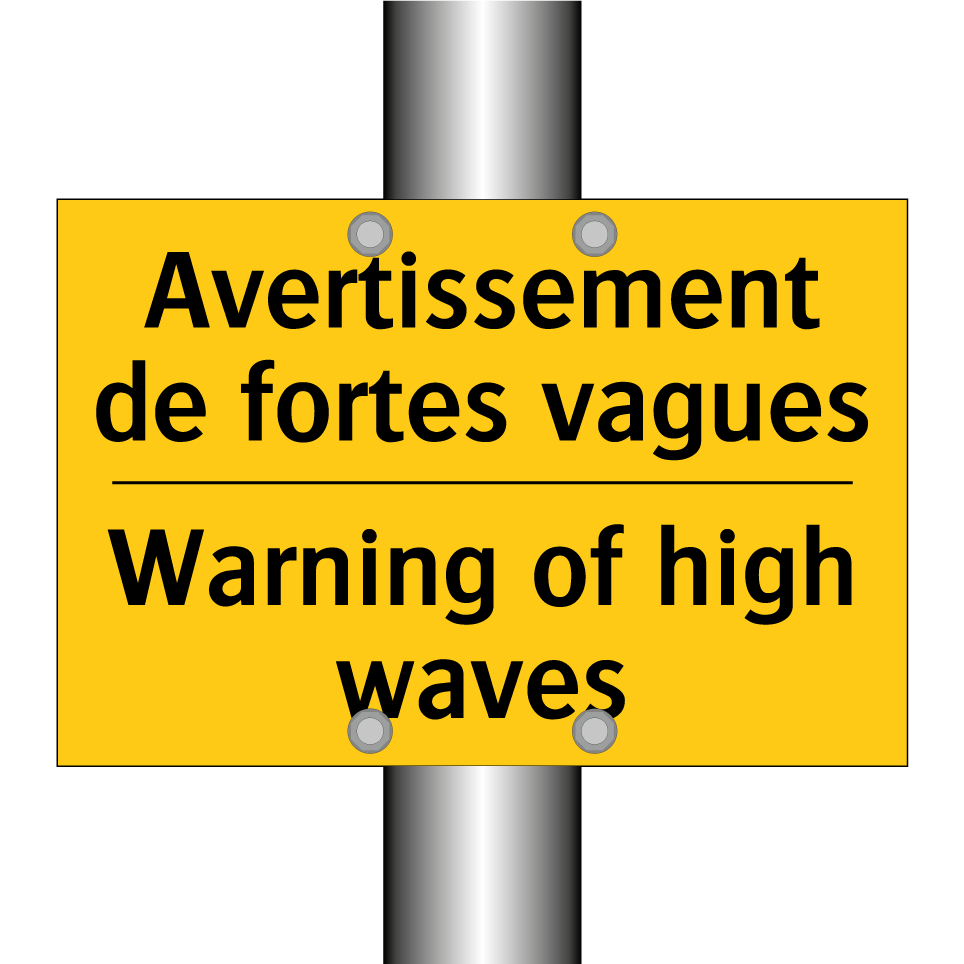 Panneau d'avertissement bilingue avec texte en français : "Avertissement de fortes vagues", et en anglais : "Warning of high waves"