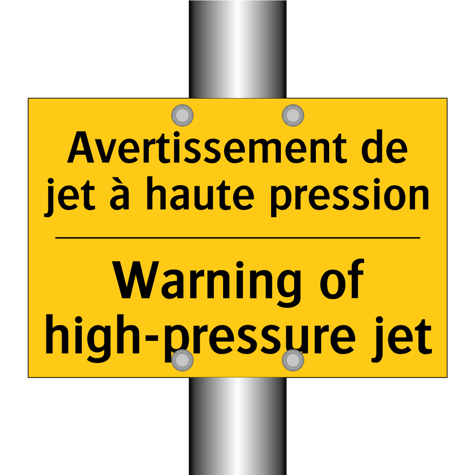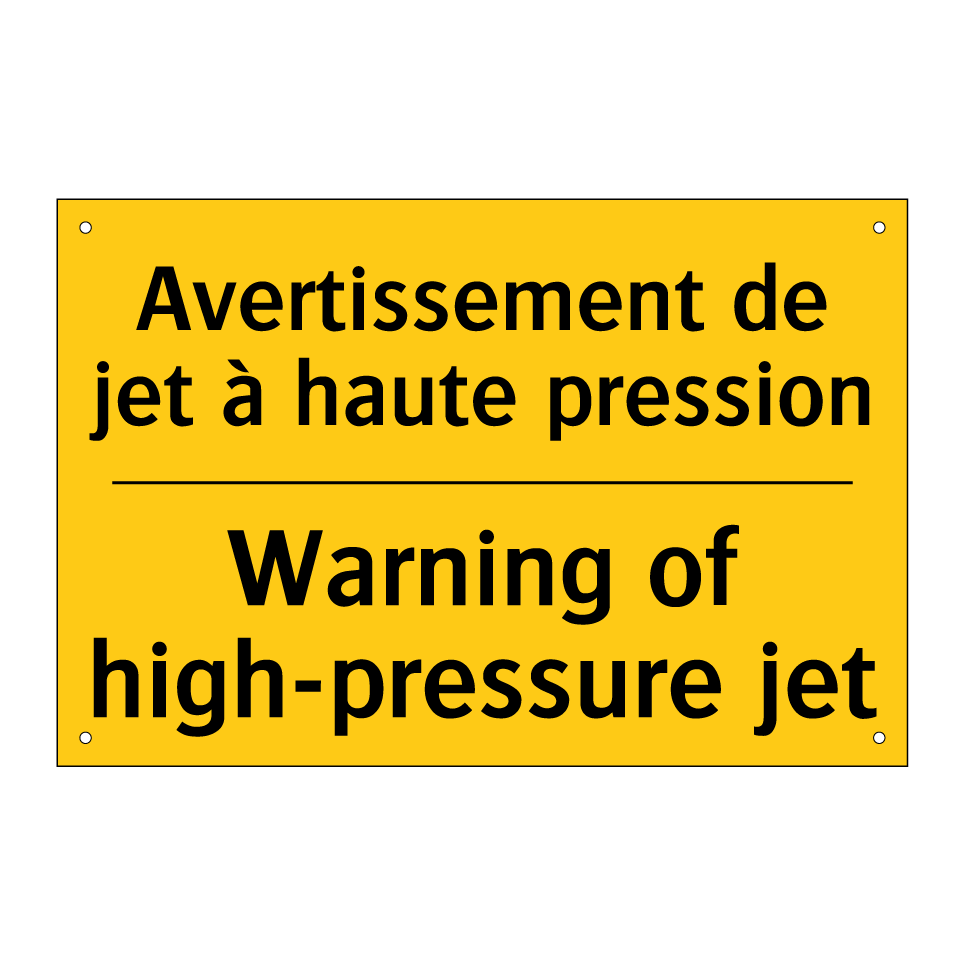 Panneau d'avertissement bilingue avec texte en français : "Avertissement de jet à haute pression", et en anglais : "Warning of high-pressure jet"