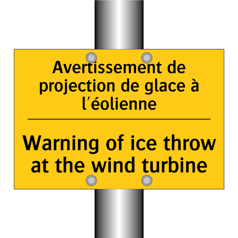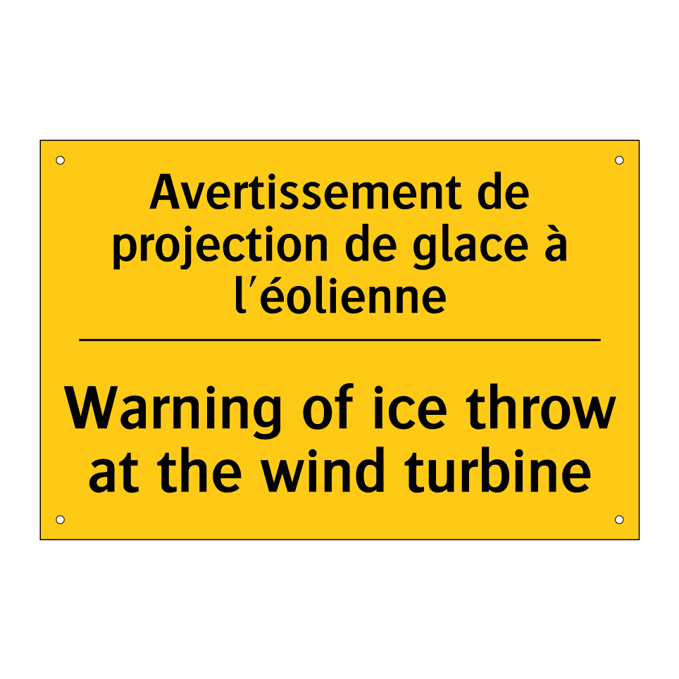 Panneau d'avertissement bilingue avec texte en français : "Avertissement de projection de glace à l'éolienne", et en anglais : "Warning of ice throw at the wind turbine"