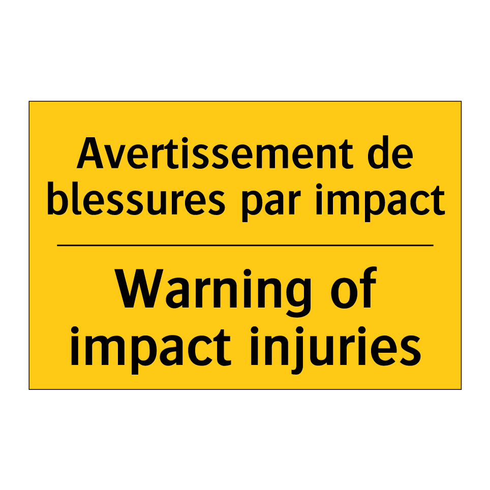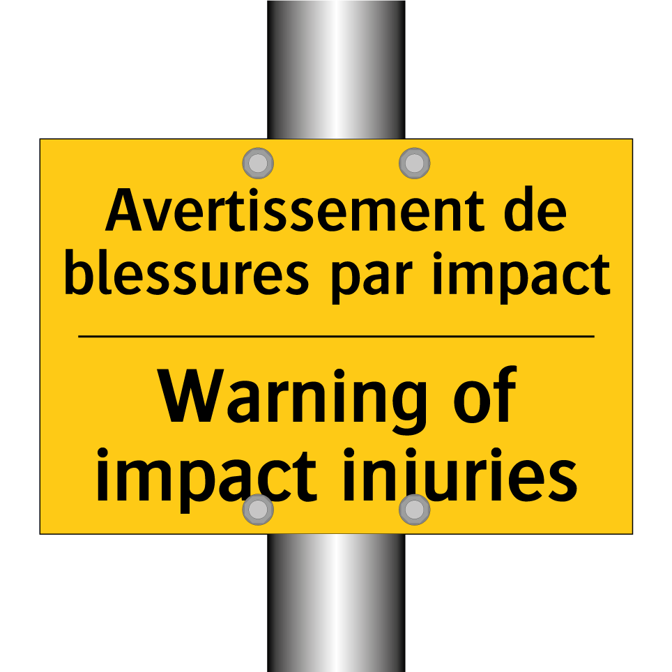 Panneau d'avertissement bilingue avec texte en français : "Avertissement de blessures par impact", et en anglais : "Warning of impact injuries"