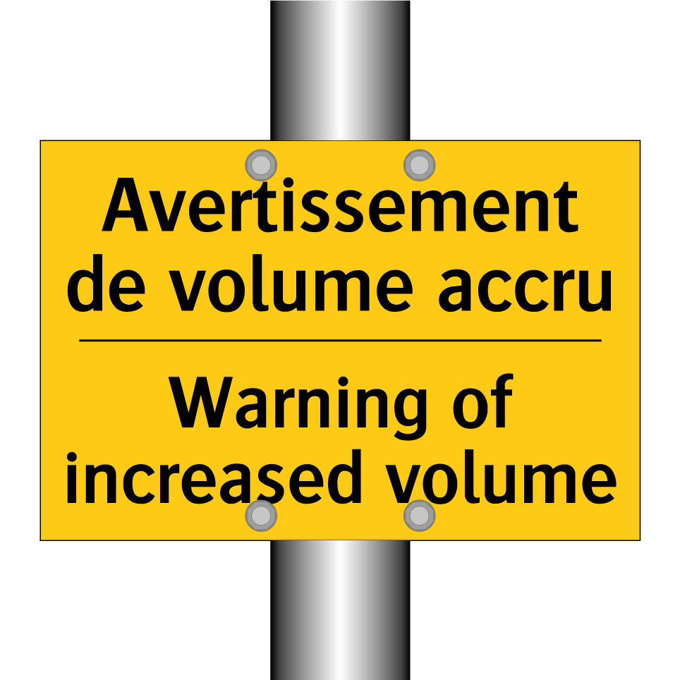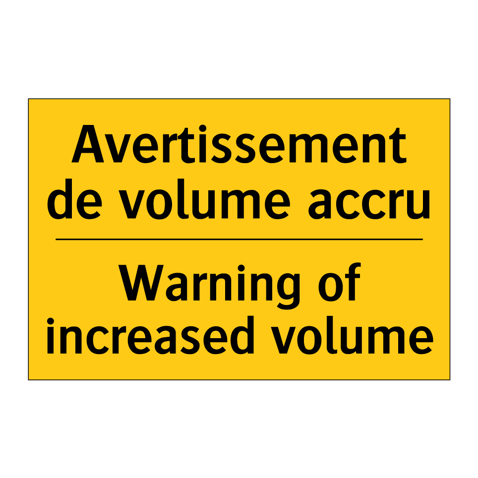 Panneau d'avertissement bilingue avec texte en français : "Avertissement de volume accru", et en anglais : "Warning of increased volume"