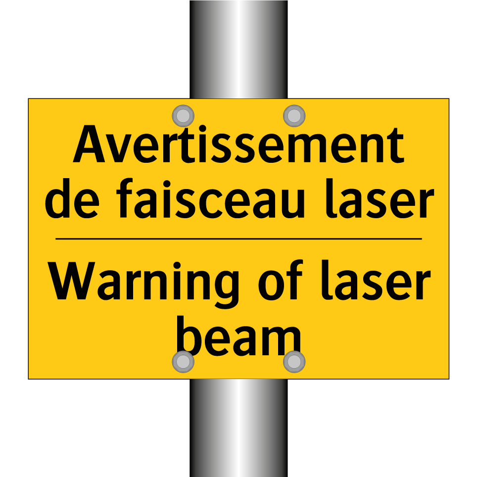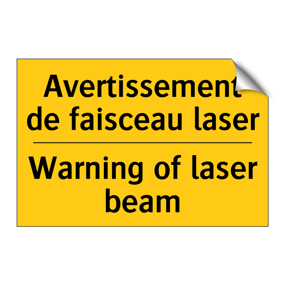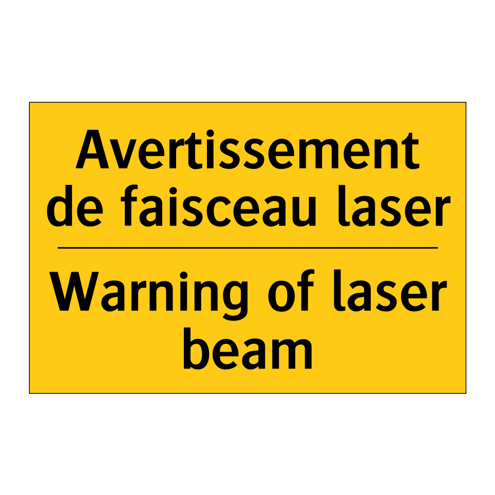 Panneau d'avertissement bilingue avec texte en français : "Avertissement de faisceau laser", et en anglais : "Warning of laser beam"