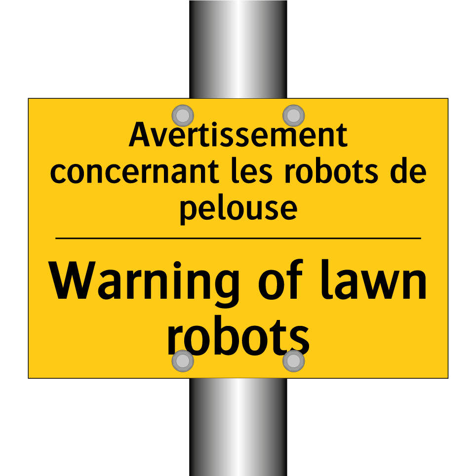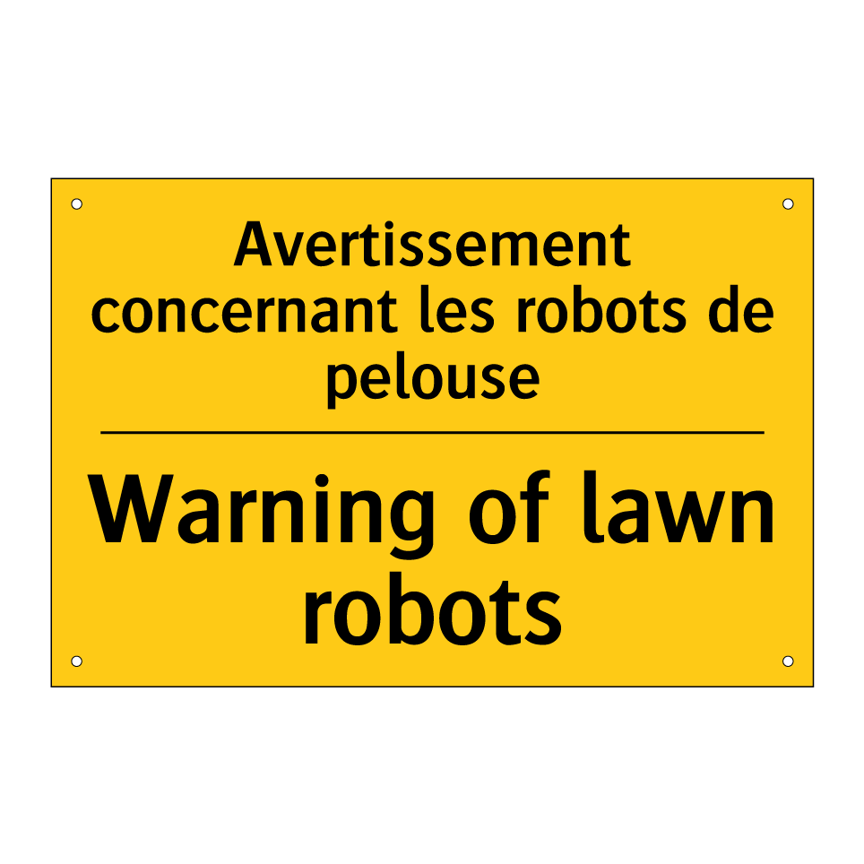 Panneau d'avertissement bilingue avec texte en français : "Avertissement concernant les robots de pelouse", et en anglais : "Warning of lawn robots"