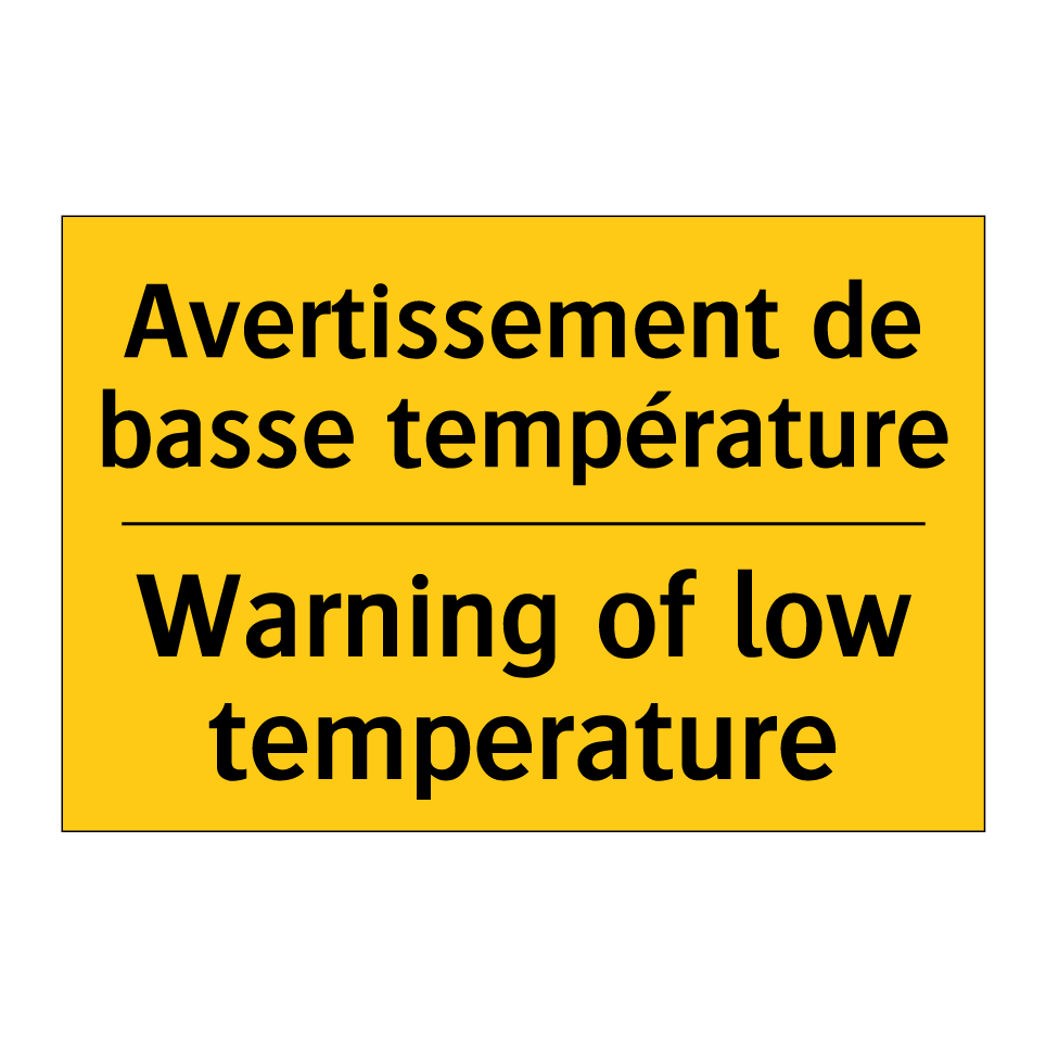 Panneau d'avertissement bilingue avec texte en français : "Avertissement de basse température", et en anglais : "Warning of low temperature"