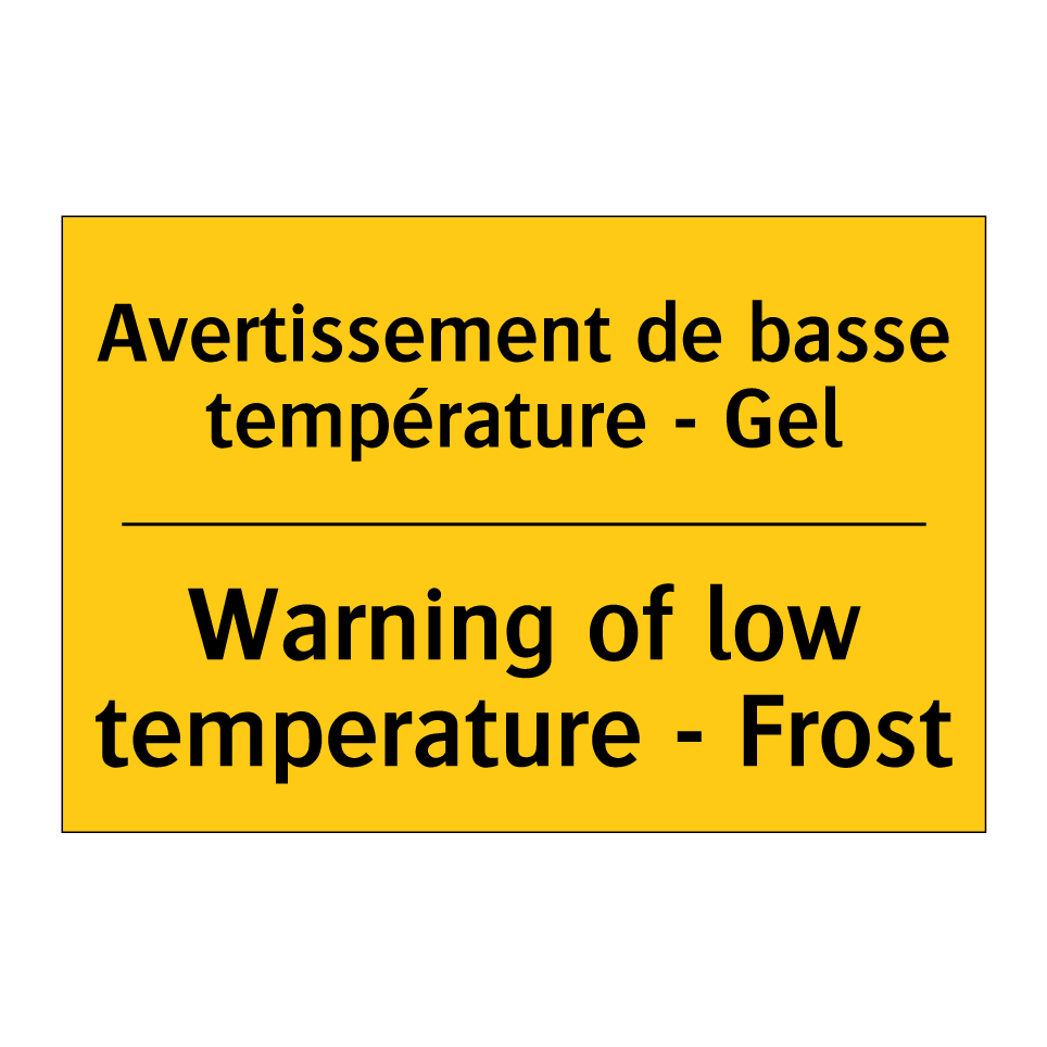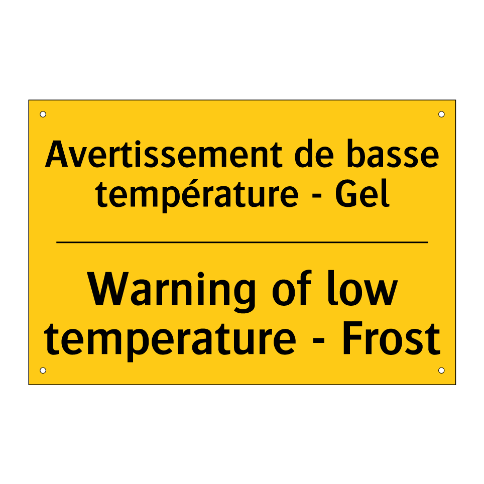 Panneau d'avertissement bilingue avec texte en français : "Avertissement de basse température - Gel", et en anglais : "Warning of low temperature - Frost"