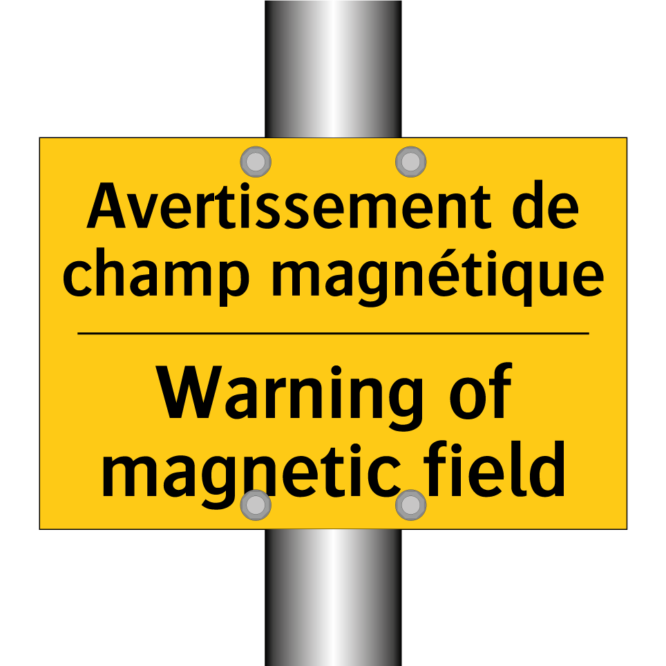 Panneau d'avertissement bilingue avec texte en français : "Avertissement de champ magnétique", et en anglais : "Warning of magnetic field"