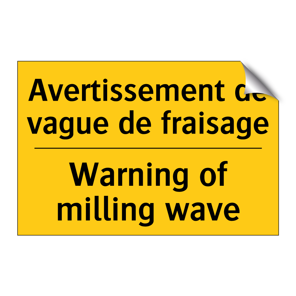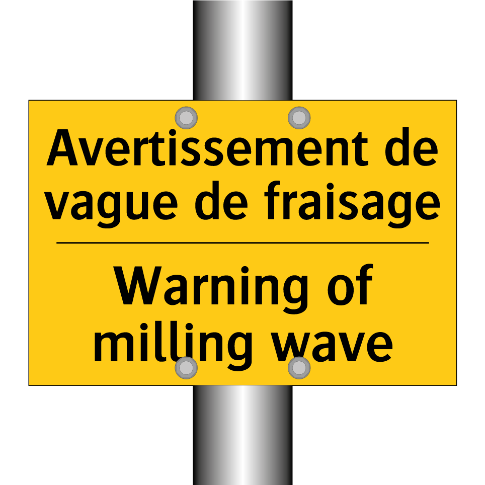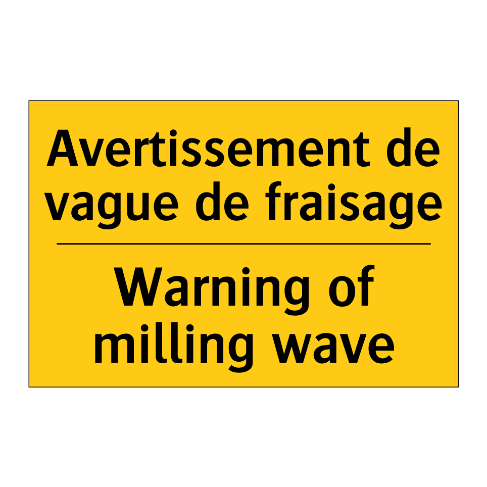 Panneau d'avertissement bilingue avec texte en français : "Avertissement de vague de fraisage", et en anglais : "Warning of milling wave"