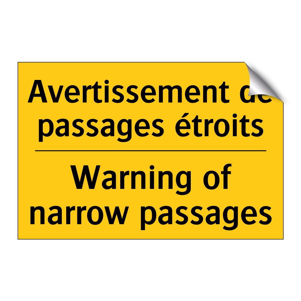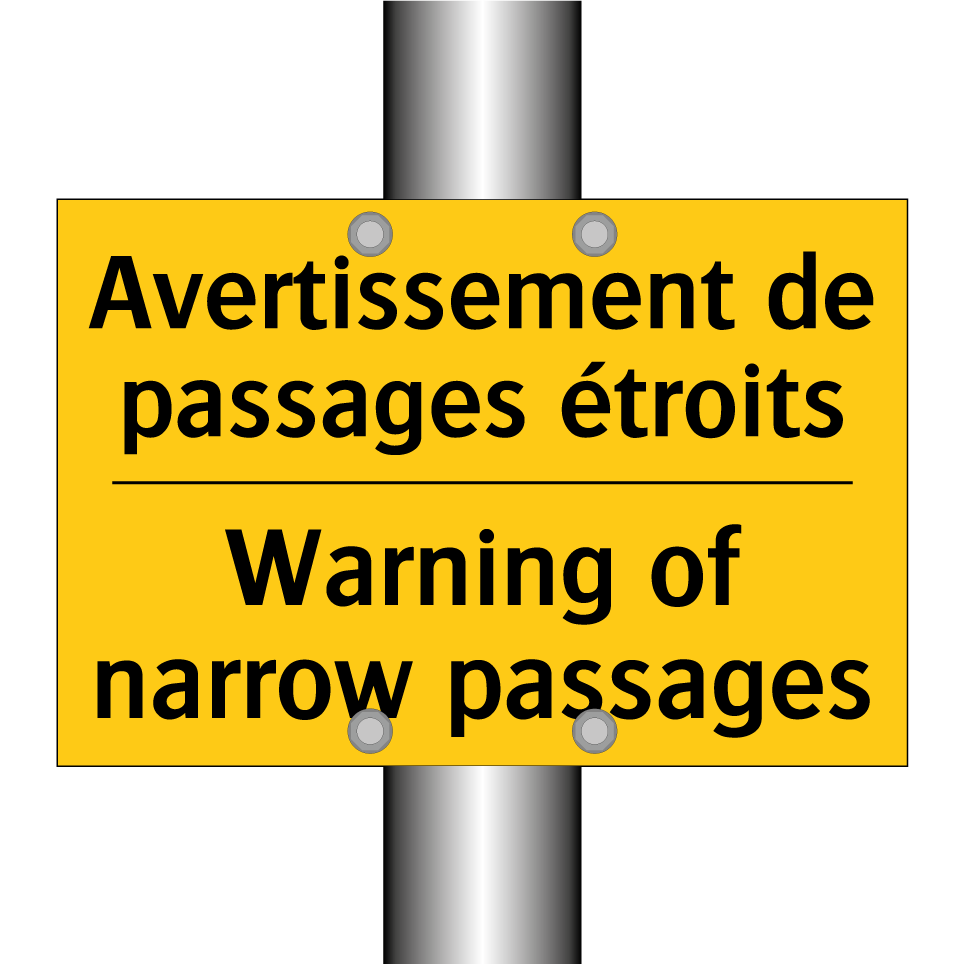 Panneau d'avertissement bilingue avec texte en français : "Avertissement de passages étroits", et en anglais : "Warning of narrow passages"