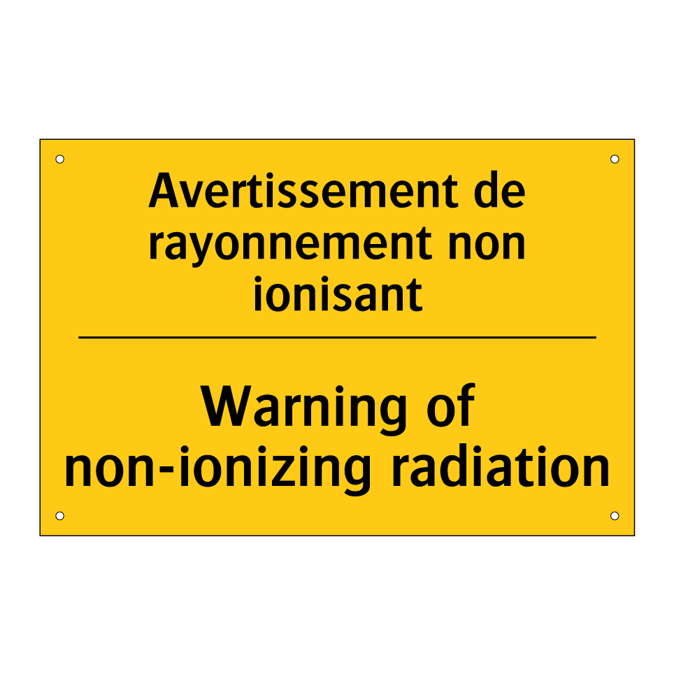 Panneau d'avertissement bilingue avec texte en français : "Avertissement de rayonnement non ionisant", et en anglais : "Warning of non-ionizing radiation"