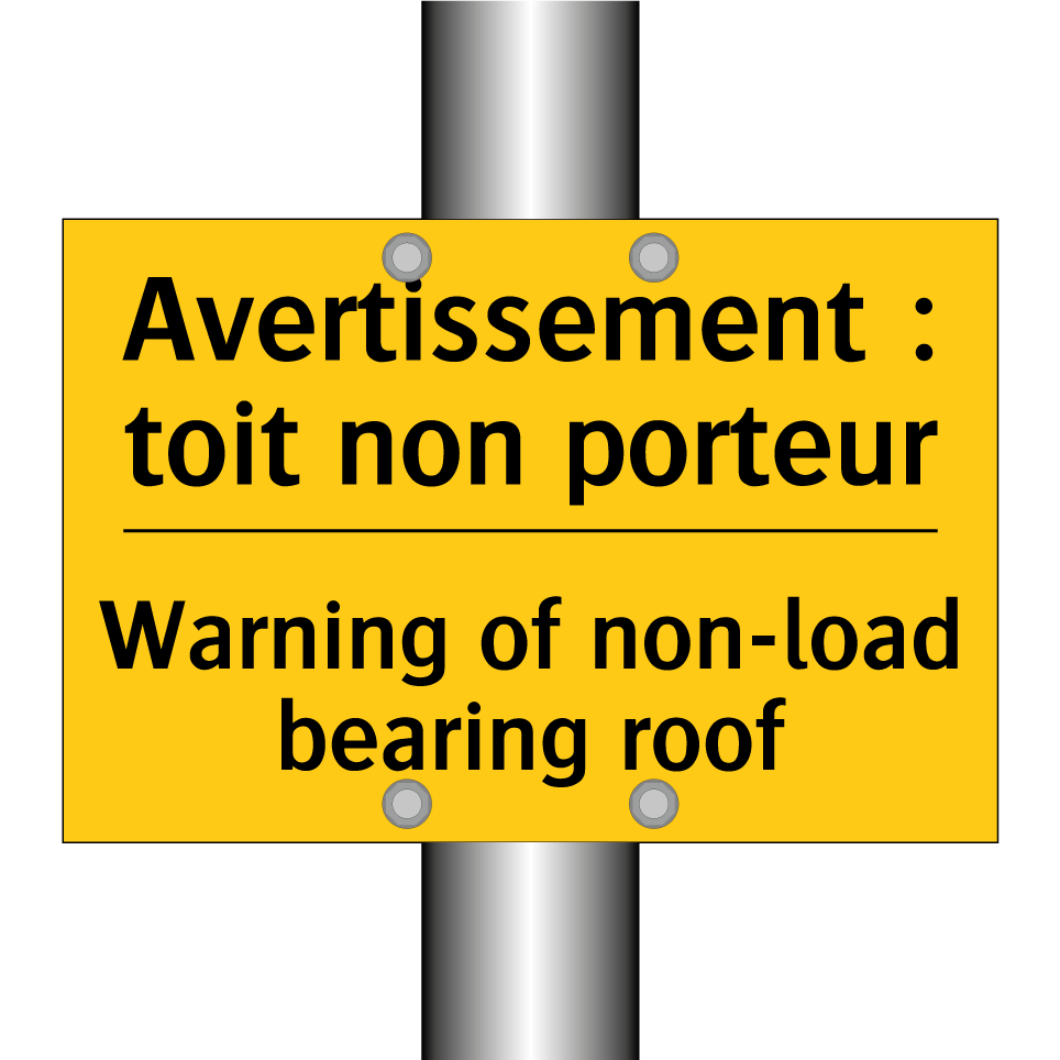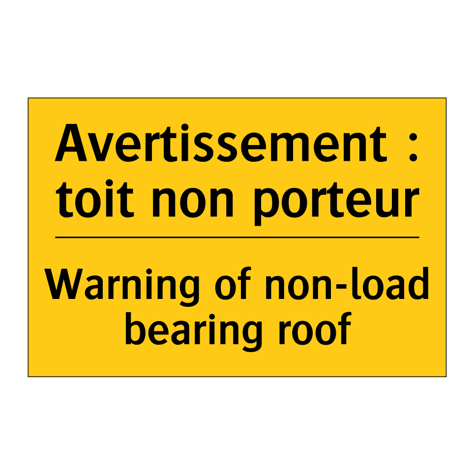 Panneau d'avertissement bilingue avec texte en français : "Avertissement : toit non porteur", et en anglais : "Warning of non-load bearing roof"