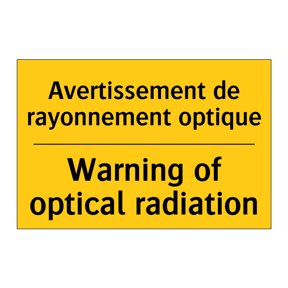 Panneau d'avertissement bilingue avec texte en français : "Avertissement de rayonnement optique", et en anglais : "Warning of optical radiation"