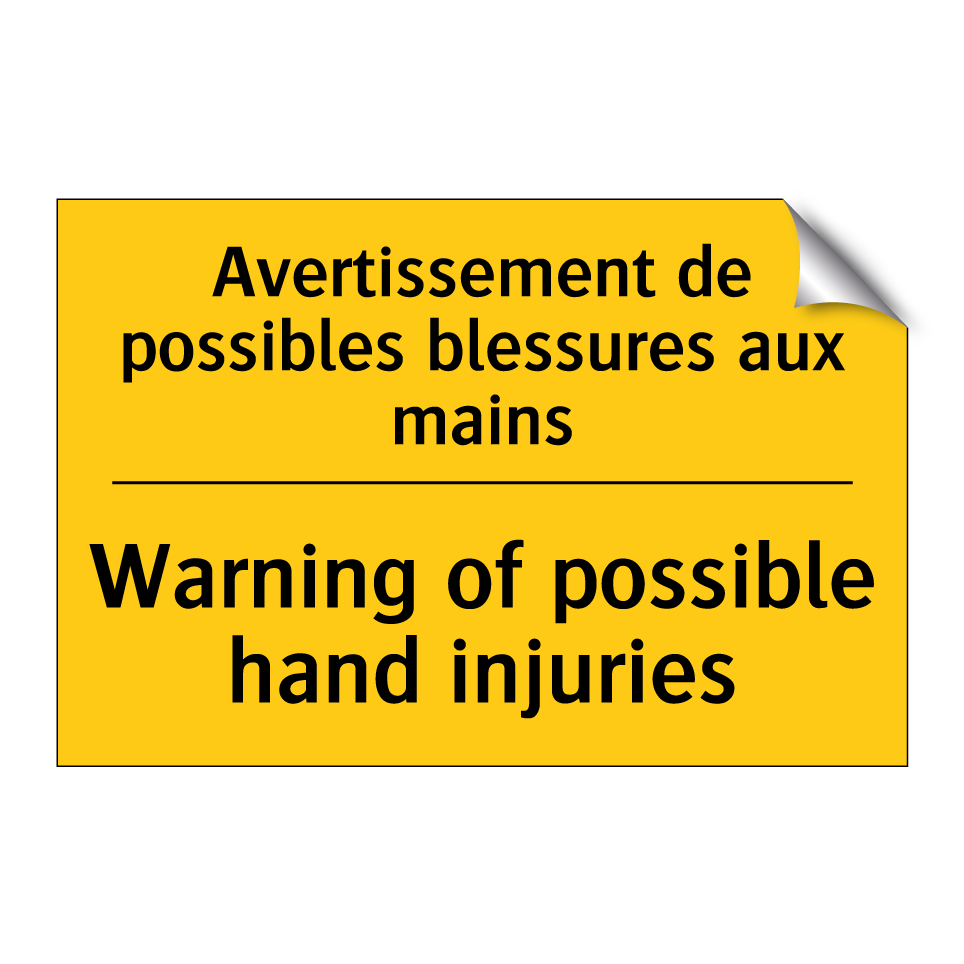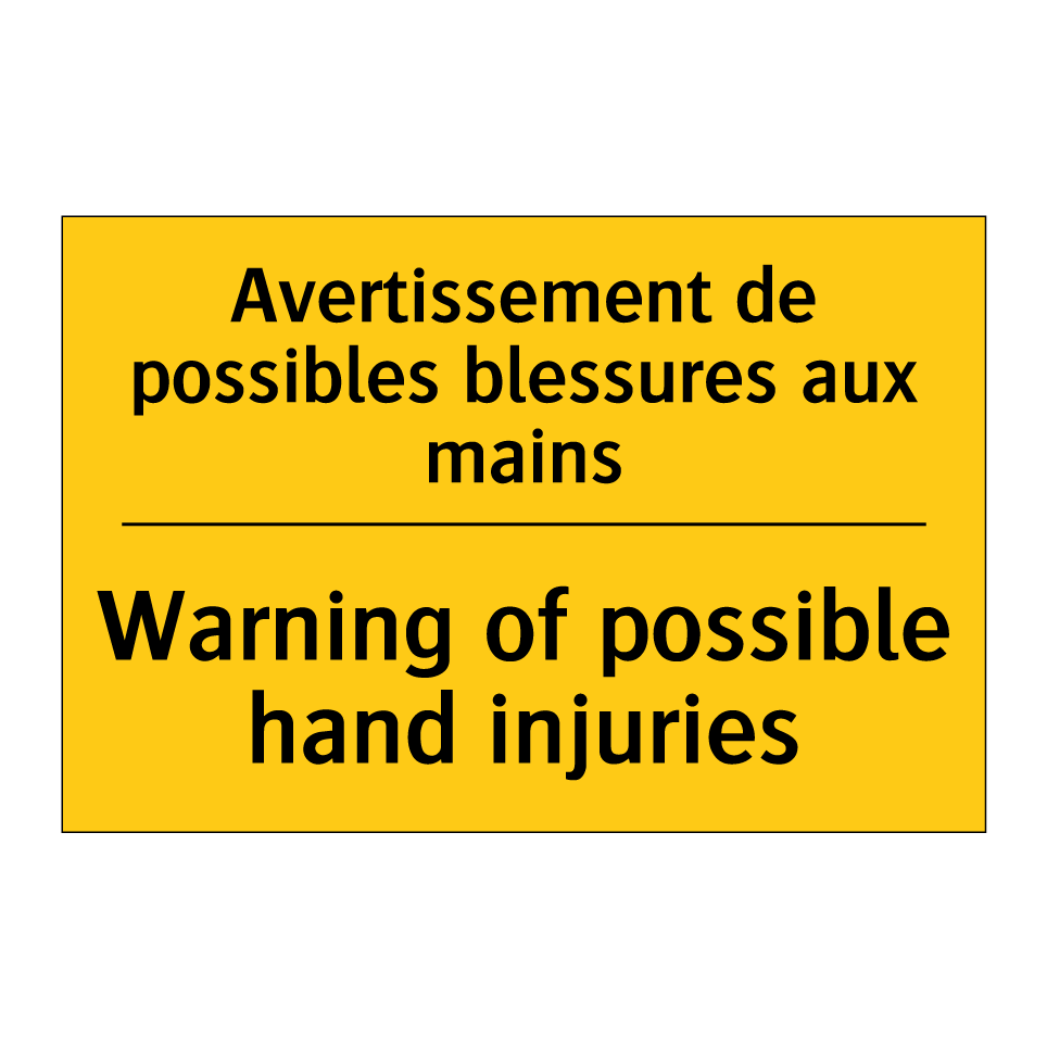 Panneau d'avertissement bilingue avec texte en français : "Avertissement de possibles blessures aux mains", et en anglais : "Warning of possible hand injuries"