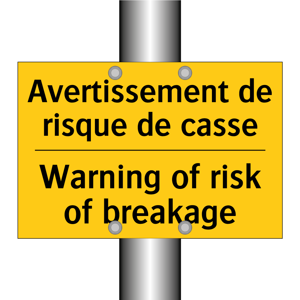 Panneau d'avertissement bilingue avec texte en français : "Avertissement de risque de casse", et en anglais : "Warning of risk of breakage"