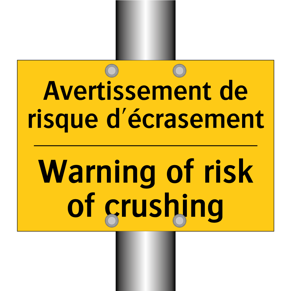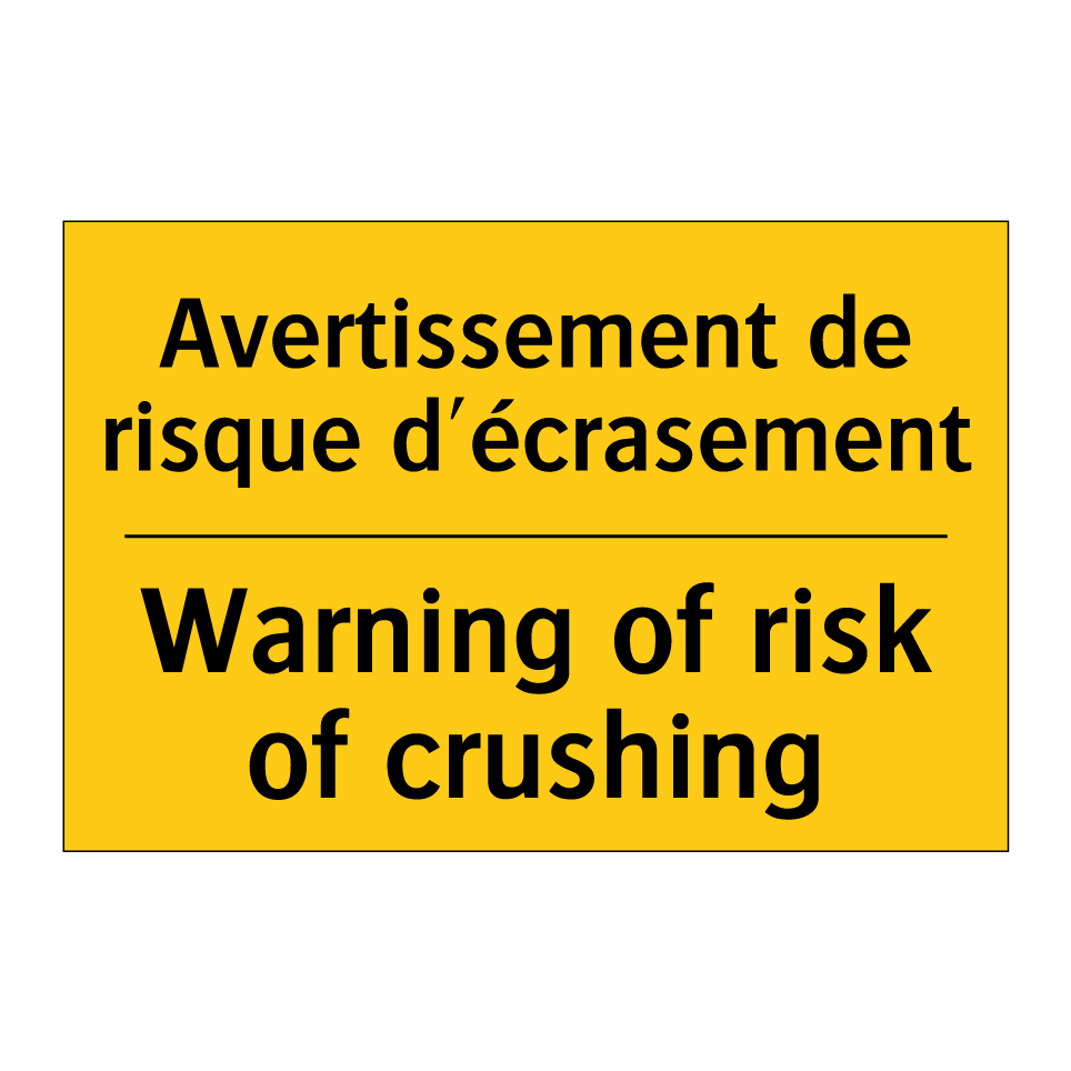 Panneau d'avertissement bilingue avec texte en français : "Avertissement de risque d'écrasement", et en anglais : "Warning of risk of crushing"