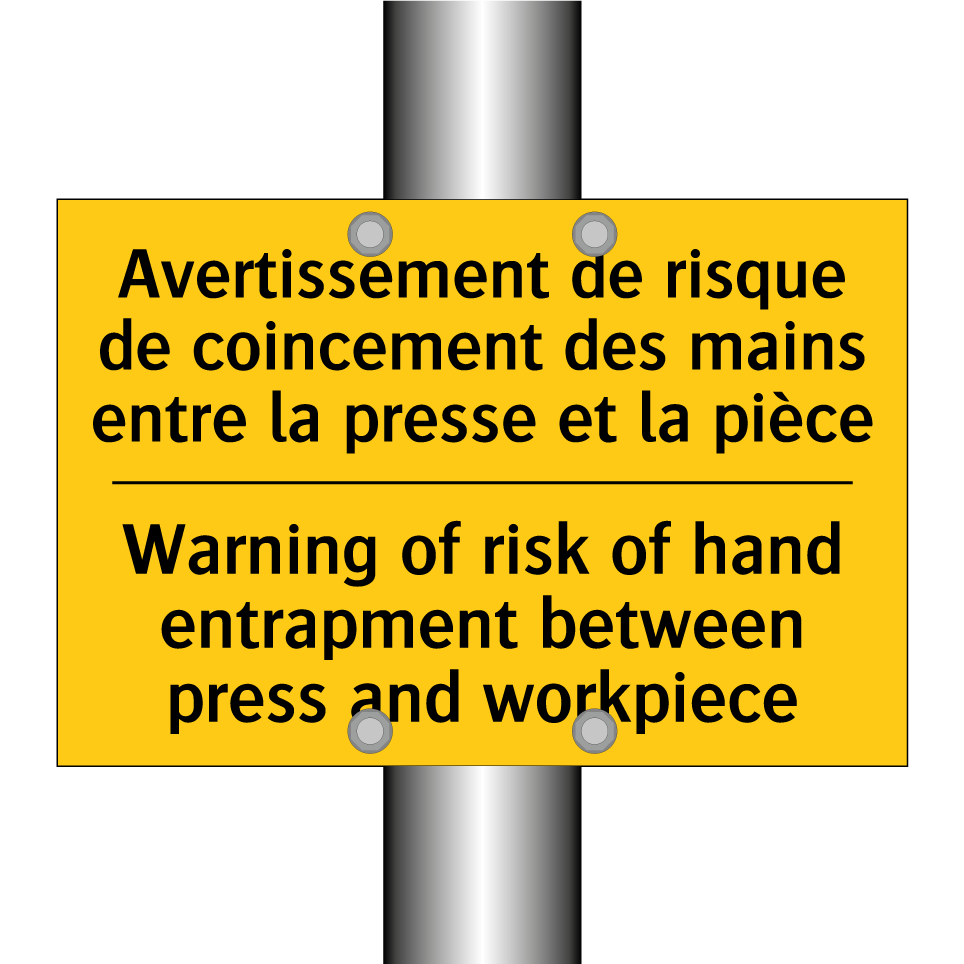Panneau d'avertissement bilingue avec texte en français : "Avertissement de risque de coincement des mains entre la presse et la pièce", et en anglais : "Warning of risk of hand entrapment between press and workpiece"