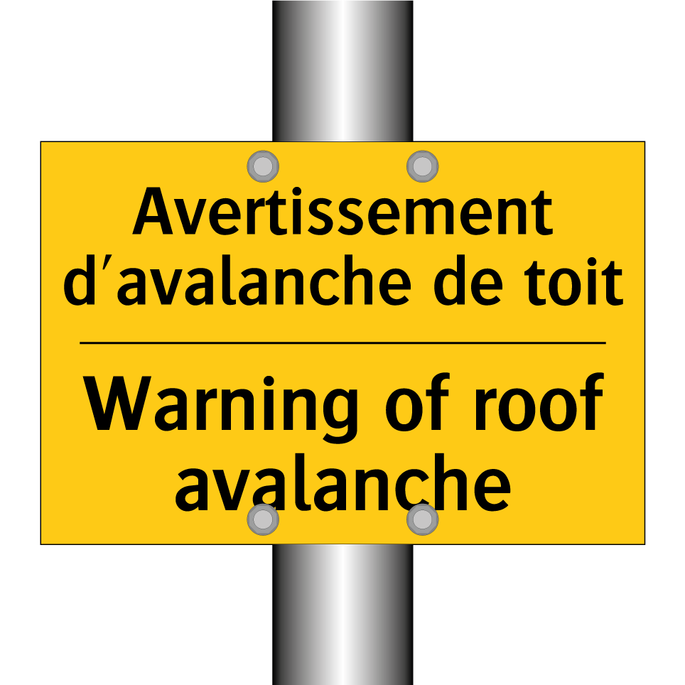 Panneau d'avertissement bilingue avec texte en français : "Avertissement d'avalanche de toit", et en anglais : "Warning of roof avalanche"