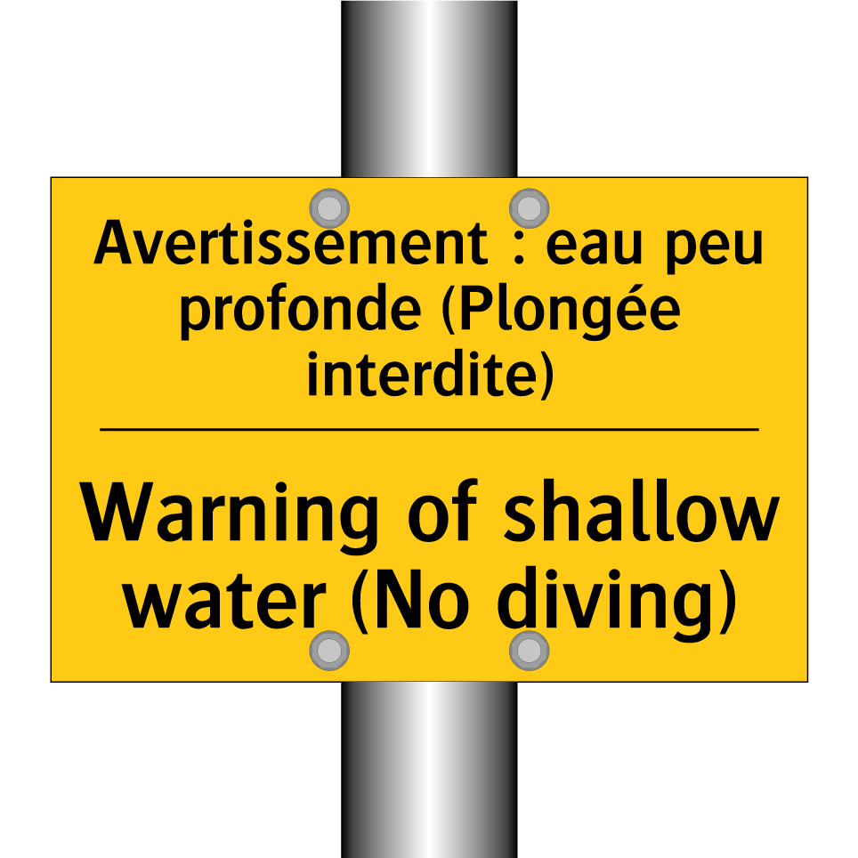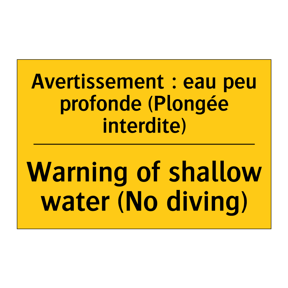 Panneau d'avertissement bilingue avec texte en français : "Avertissement : eau peu profonde (Plongée interdite)", et en anglais : "Warning of shallow water (No diving)"
