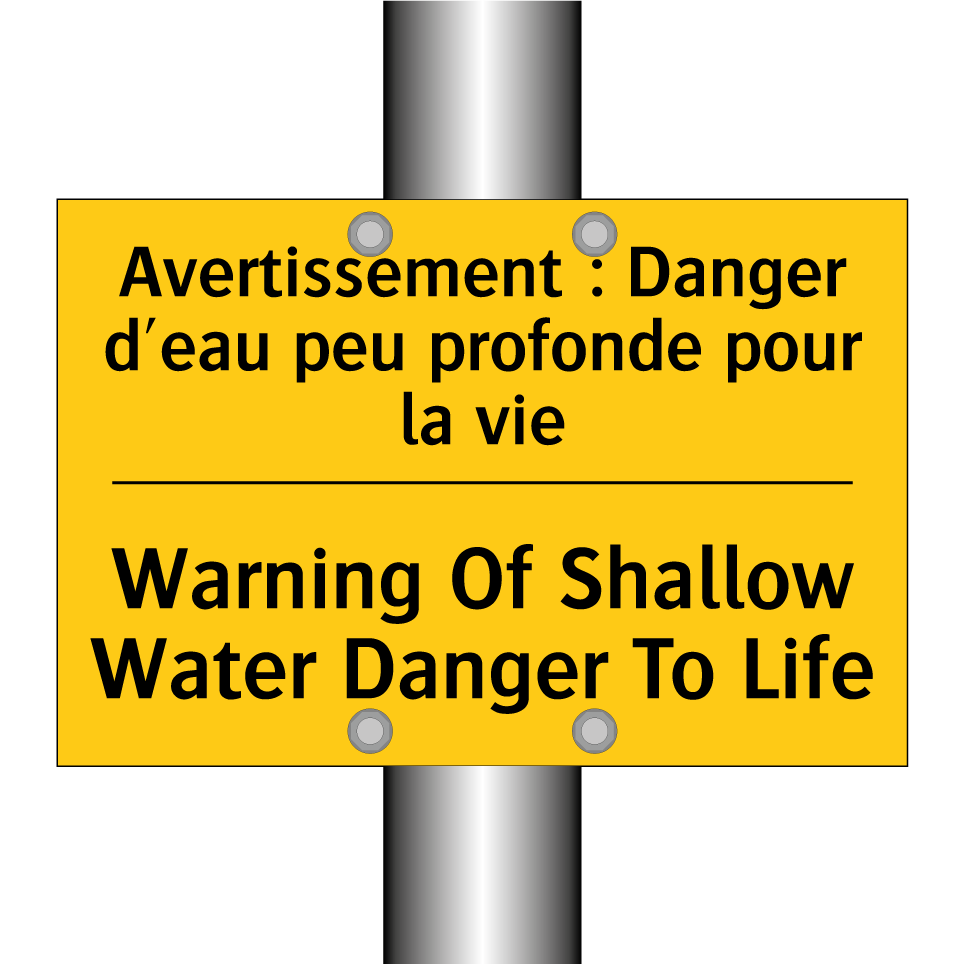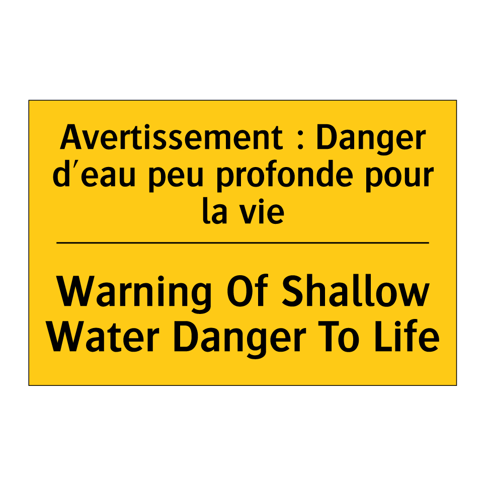 Panneau d'avertissement bilingue avec texte en français : "Avertissement : Danger d'eau peu profonde pour la vie", et en anglais : "Warning Of Shallow Water Danger To Life"