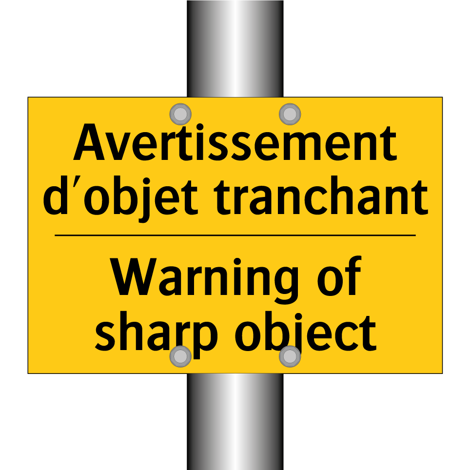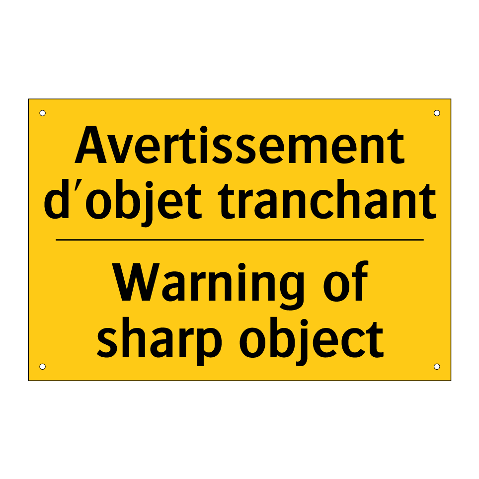 Panneau d'avertissement bilingue avec texte en français : "Avertissement d'objet tranchant", et en anglais : "Warning of sharp object"
