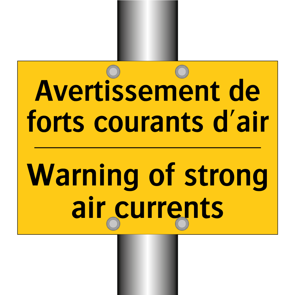 Panneau d'avertissement bilingue avec texte en français : "Avertissement de forts courants d'air", et en anglais : "Warning of strong air currents"