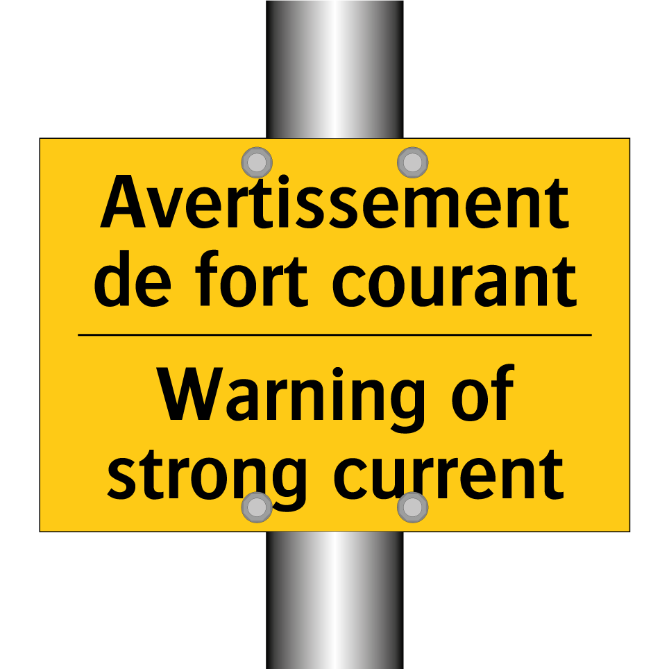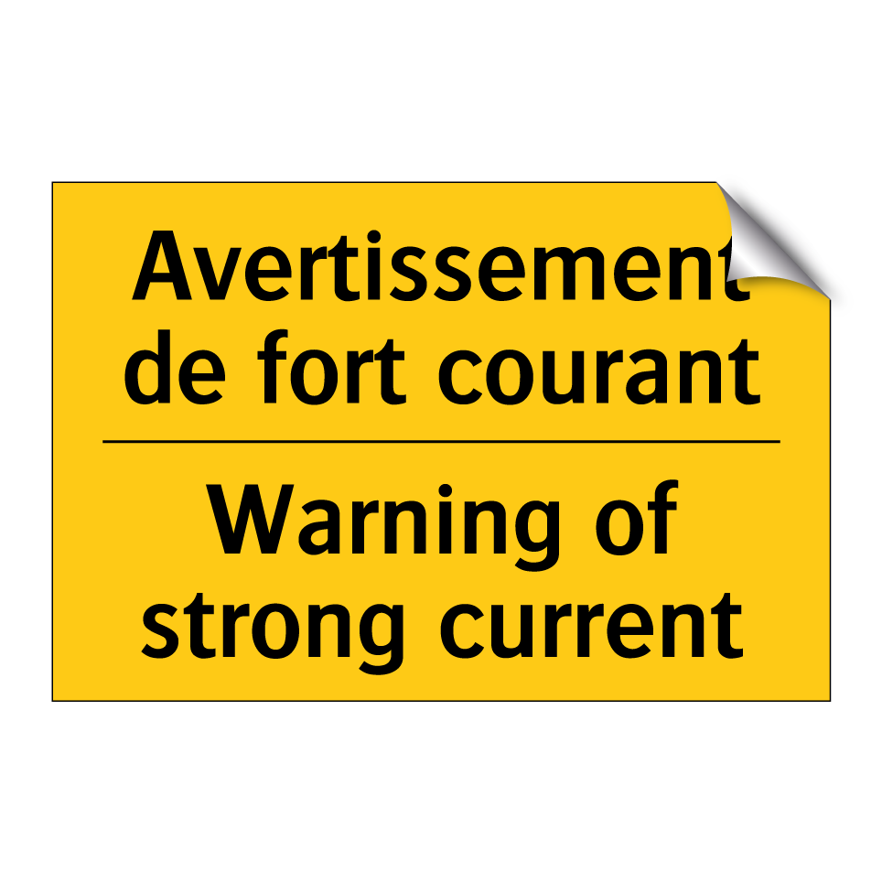 Panneau d'avertissement bilingue avec texte en français : "Avertissement de fort courant", et en anglais : "Warning of strong current"