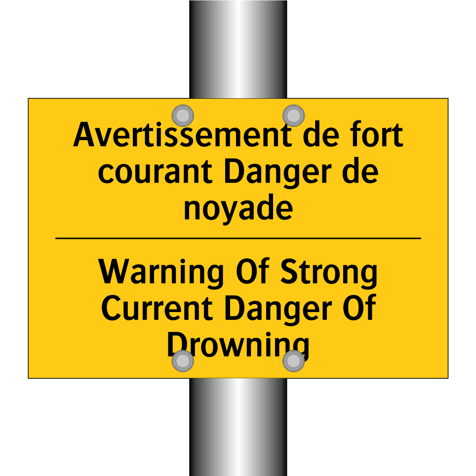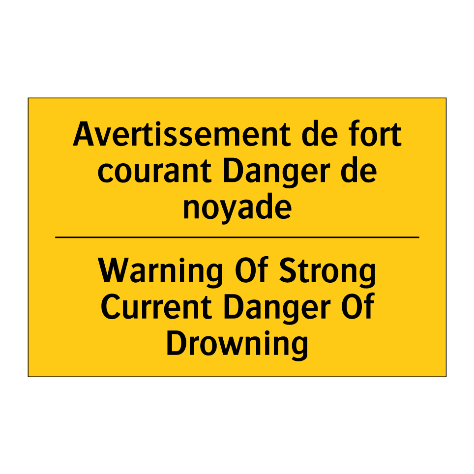 Panneau d'avertissement bilingue avec texte en français : "Avertissement de fort courant Danger de noyade", et en anglais : "Warning Of Strong Current Danger Of Drowning"