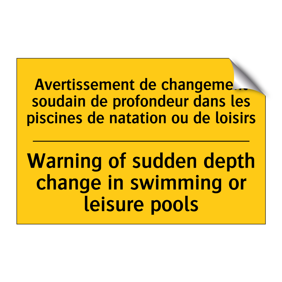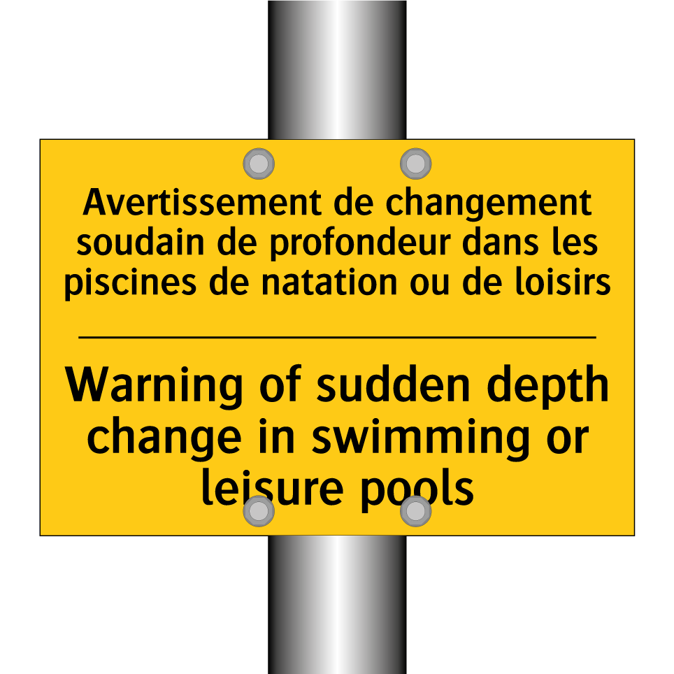 Panneau d'avertissement bilingue avec texte en français : "Avertissement de changement soudain de profondeur dans les piscines de natation ou de loisirs", et en anglais : "Warning of sudden depth change in swimming or leisure pools"