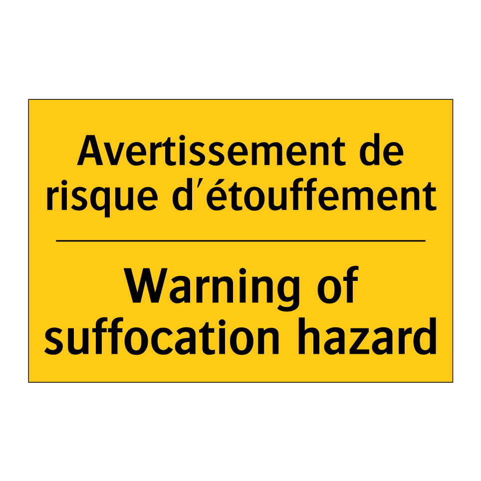 Panneau d'avertissement bilingue avec texte en français : "Avertissement de risque d'étouffement", et en anglais : "Warning of suffocation hazard"