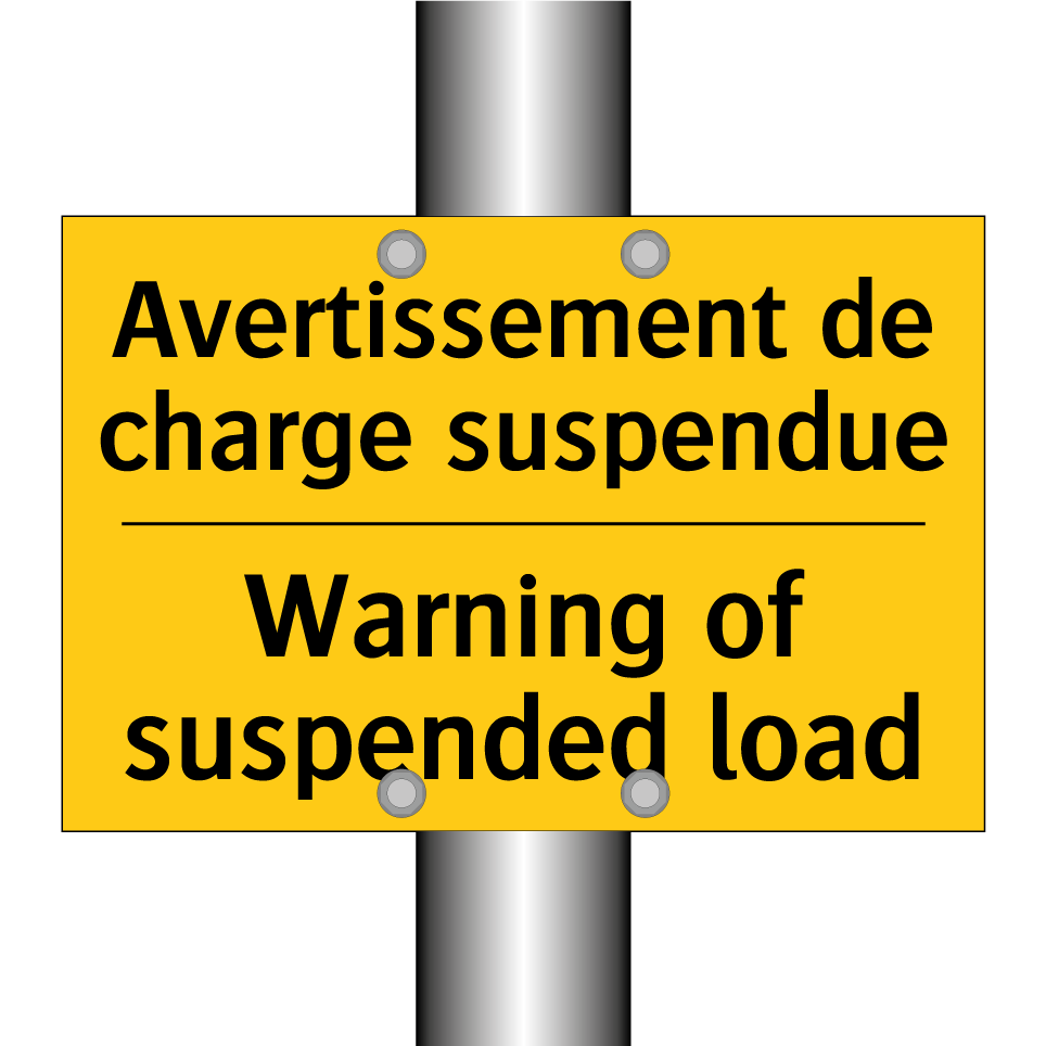 Panneau d'avertissement bilingue avec texte en français : "Avertissement de charge suspendue", et en anglais : "Warning of suspended load"