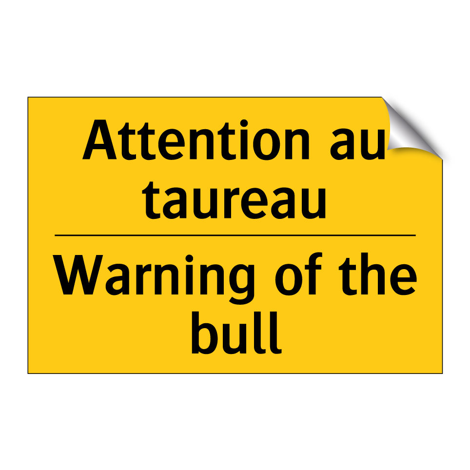 Panneau d'avertissement bilingue avec texte en français : "Attention au taureau", et en anglais : "Warning of the bull"