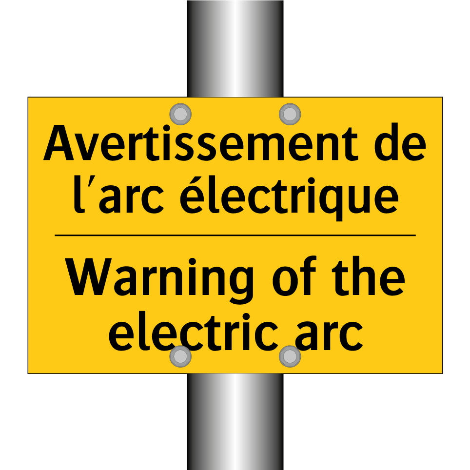 Panneau d'avertissement bilingue avec texte en français : "Avertissement de l'arc électrique", et en anglais : "Warning of the electric arc"