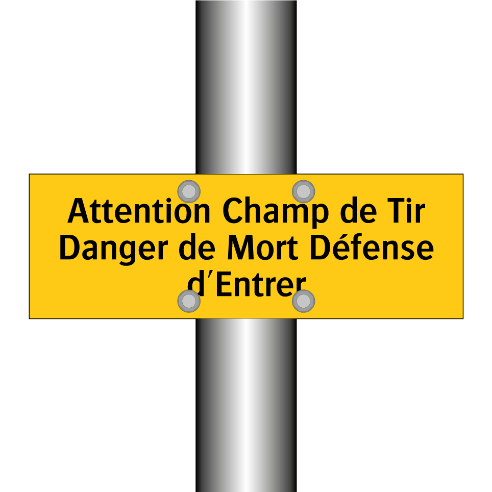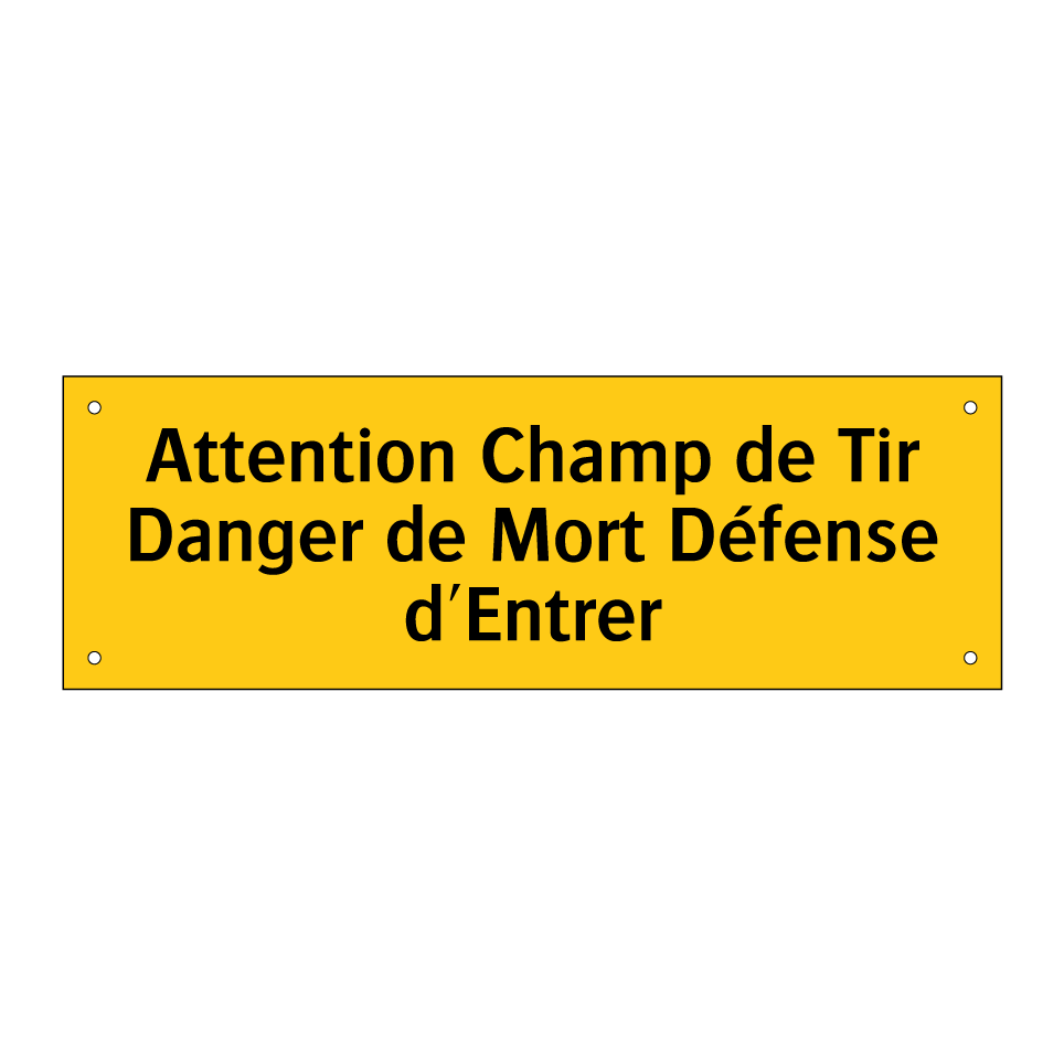 Panneau d'avertissement avec le texte : "Attention Champ de Tir Danger de Mort Défense d'Entrer"