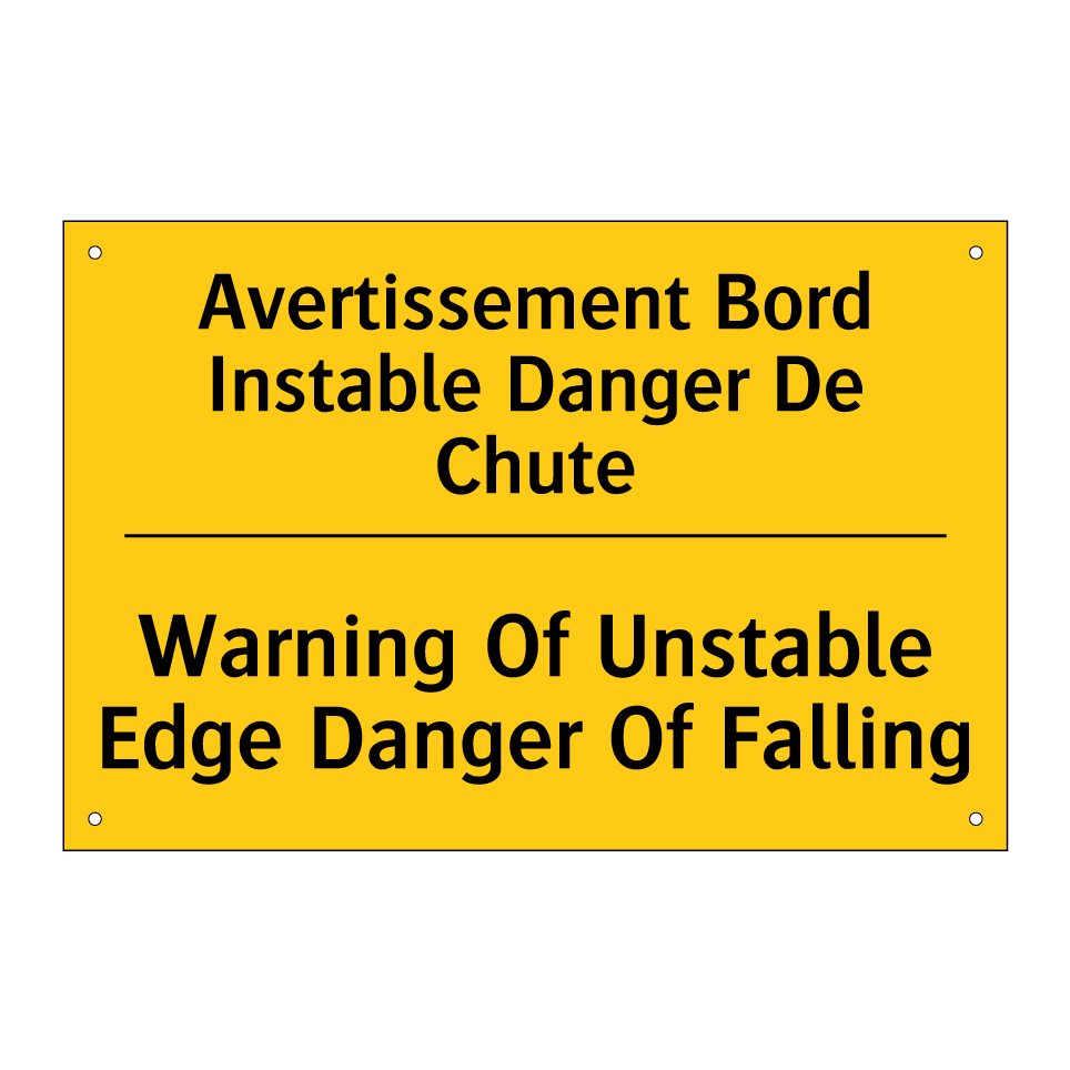 Panneau d'avertissement bilingue avec texte en français : "Avertissement Bord Instable Danger De Chute", et en anglais : "Warning Of Unstable Edge Danger Of Falling"