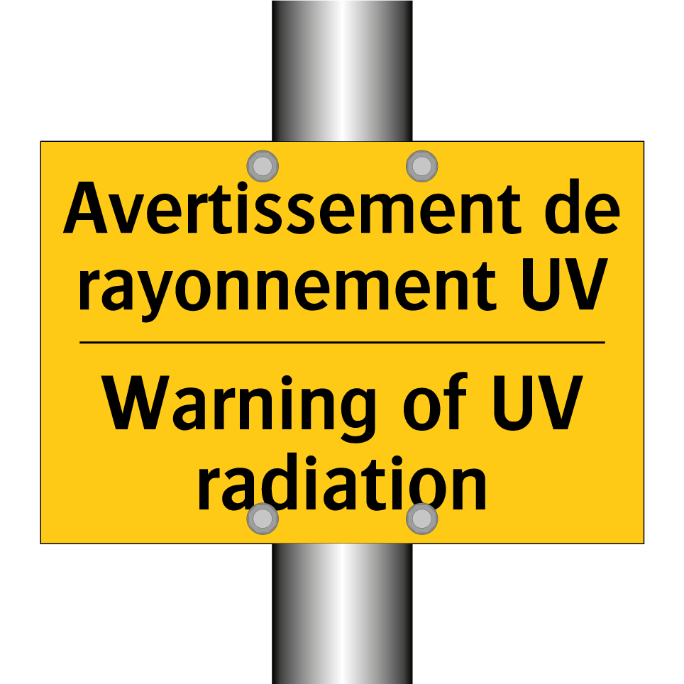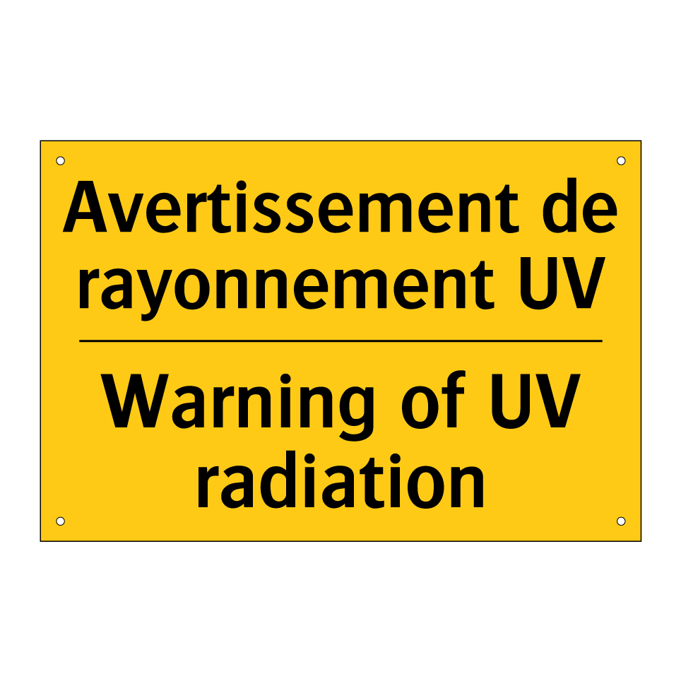 Panneau d'avertissement bilingue avec texte en français : "Avertissement de rayonnement UV", et en anglais : "Warning of UV radiation"
