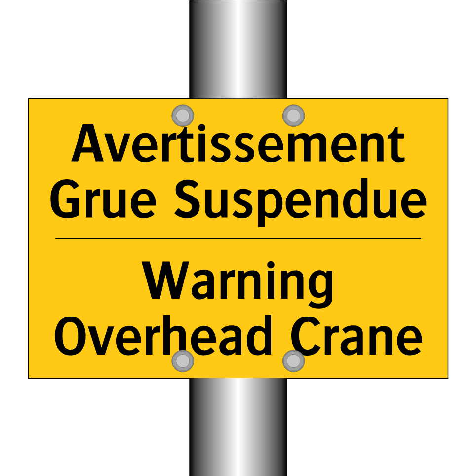 Panneau d'avertissement bilingue avec texte en français : "Avertissement Grue Suspendue", et en anglais : "Warning Overhead Crane"