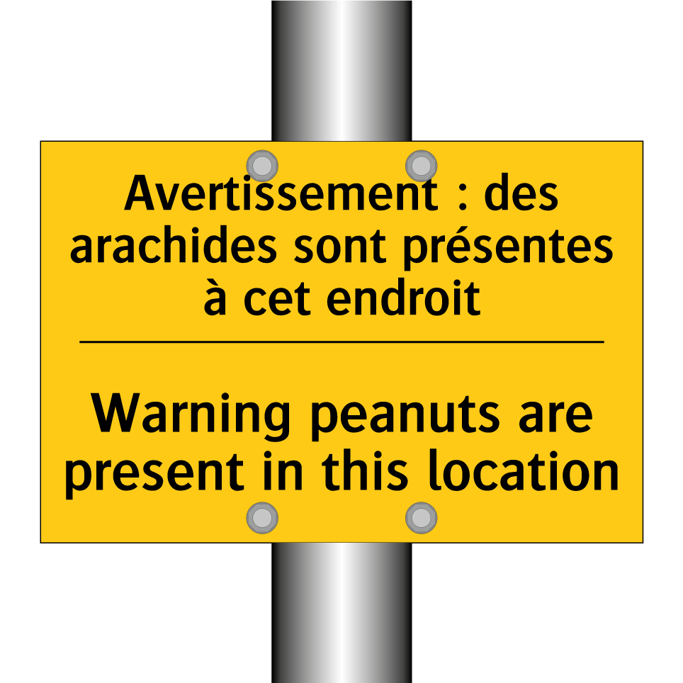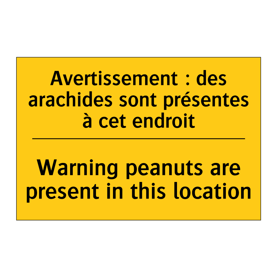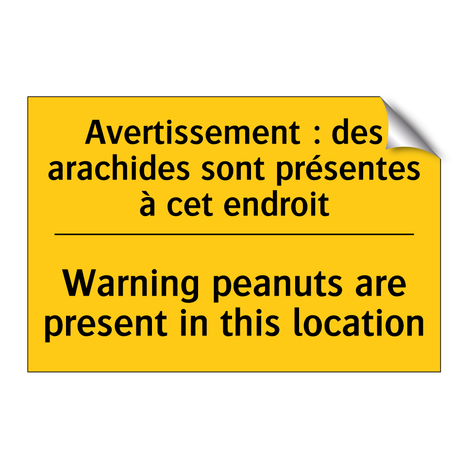 Panneau d'avertissement bilingue avec texte en français : "Avertissement : des arachides sont présentes à cet endroit", et en anglais : "Warning peanuts are present in this location"