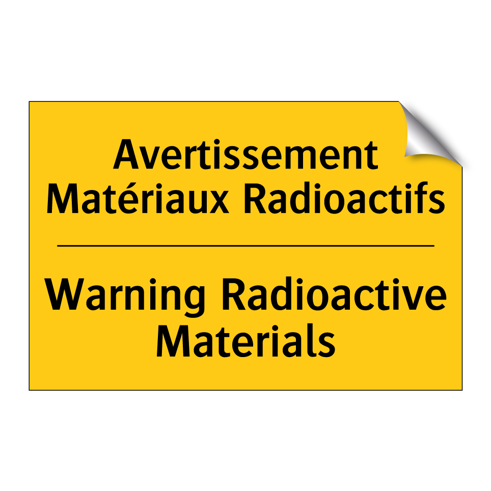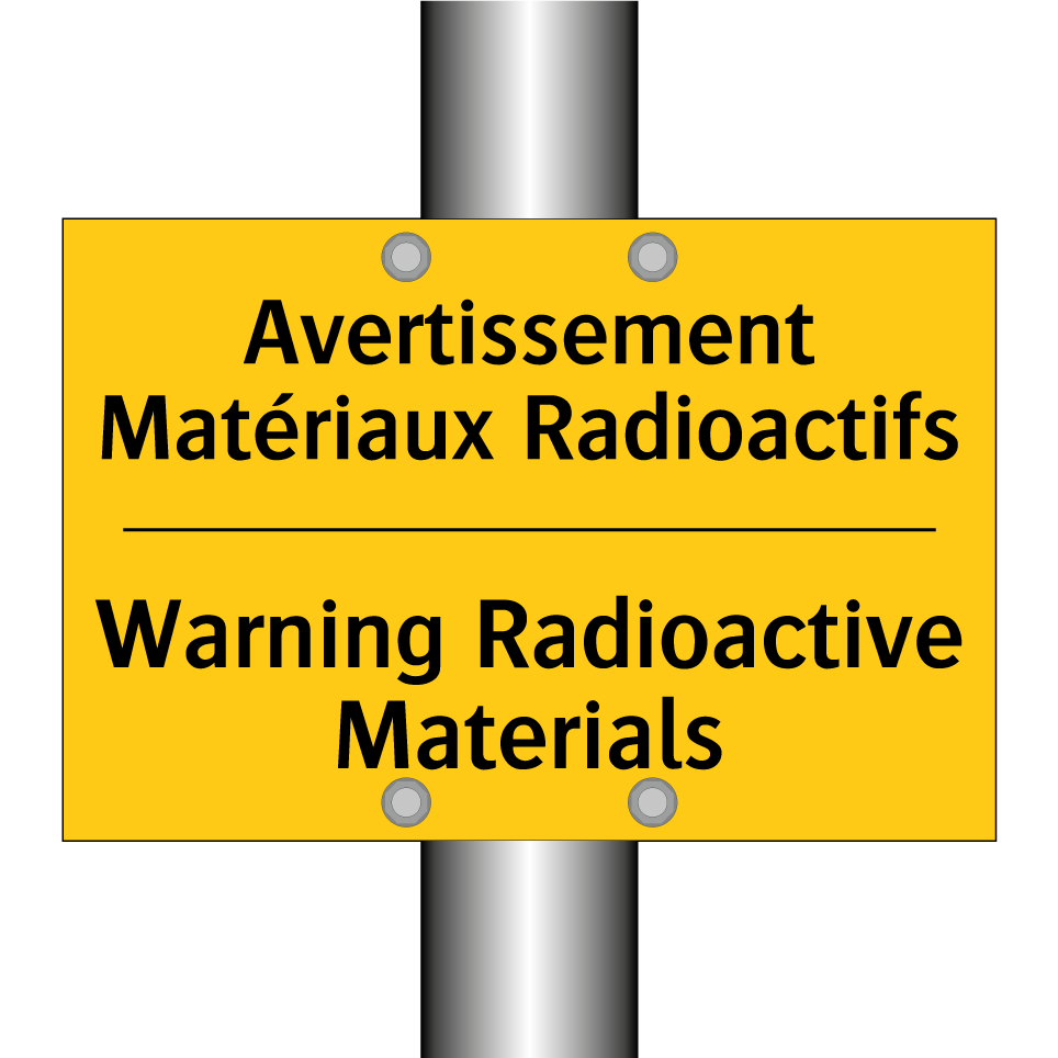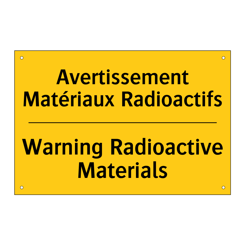 Panneau d'avertissement bilingue avec texte en français : "Avertissement Matériaux Radioactifs", et en anglais : "Warning Radioactive Materials"