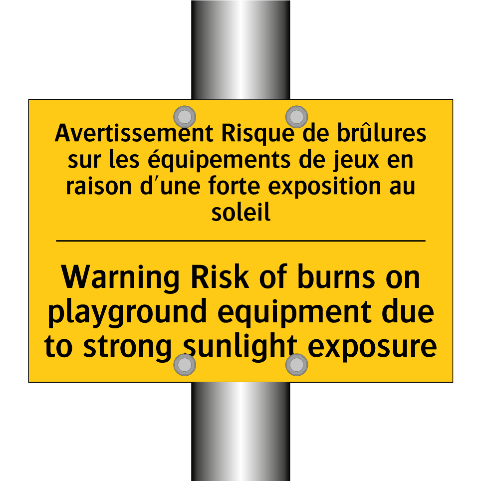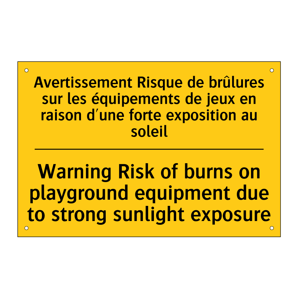 Panneau d'avertissement bilingue avec texte en français : "Avertissement Risque de brûlures sur les équipements de jeux en raison d'une forte exposition au soleil", et en anglais : "Warning Risk of burns on playground equipment due to strong sunlight exposure"